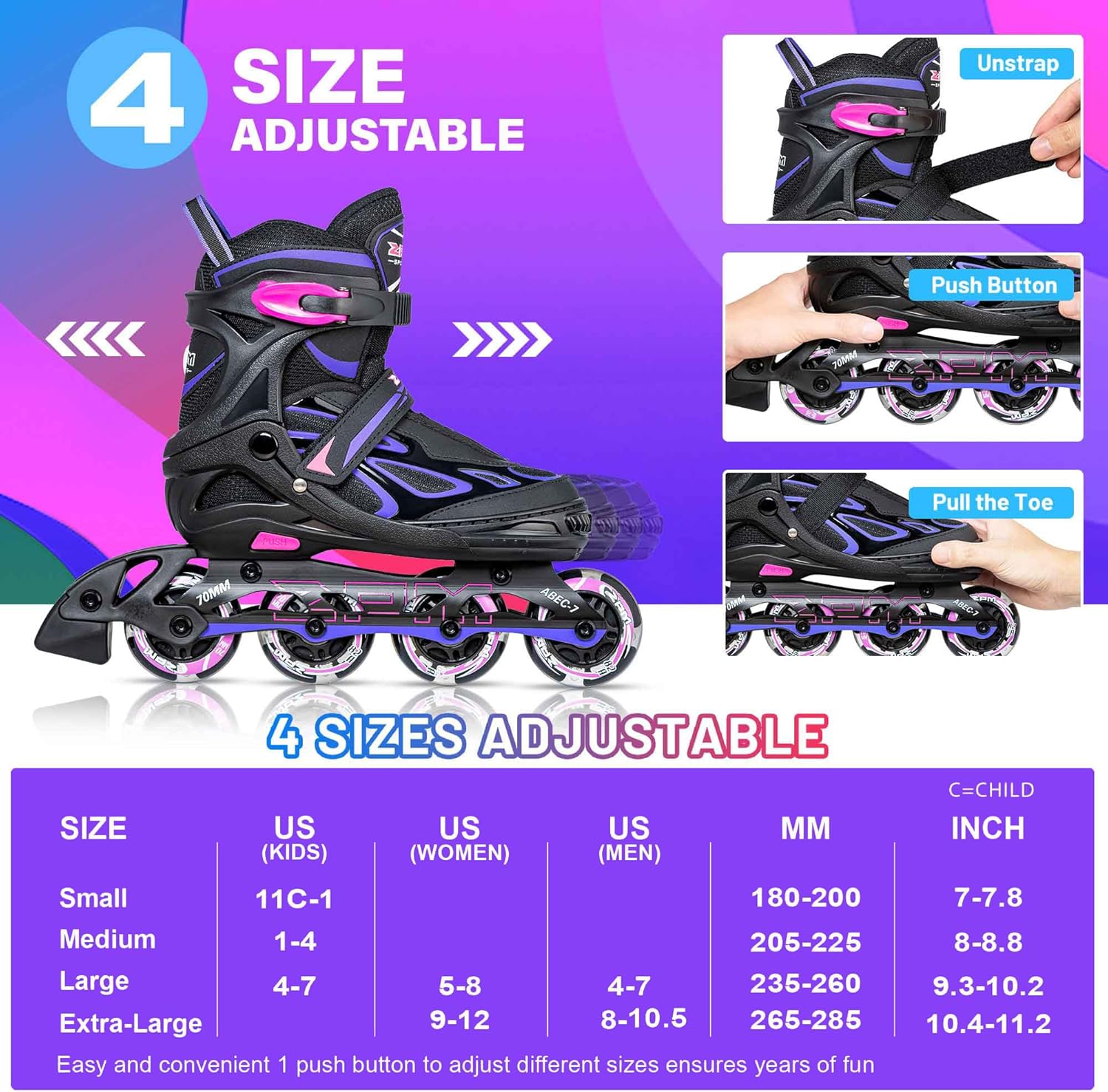 - Patines en línea ajustables de 4 tamaños: los niños pueden montar en estos patines durante mucho tiempo, ya que podrás aumentar la bota hasta cuatro tamaños. 4 tamaños disponibles: S para niños pequeños; M para niños grandes; L para adultos jóvenes, XL para adultos, revisa la imagen de nuestra tabla de tallas para ver la longitud específica de la bota
