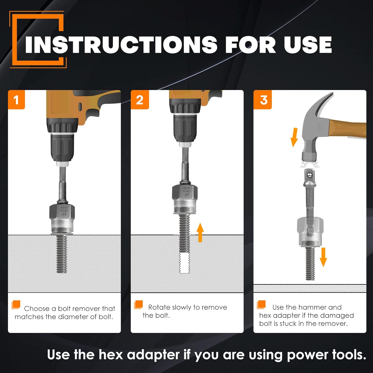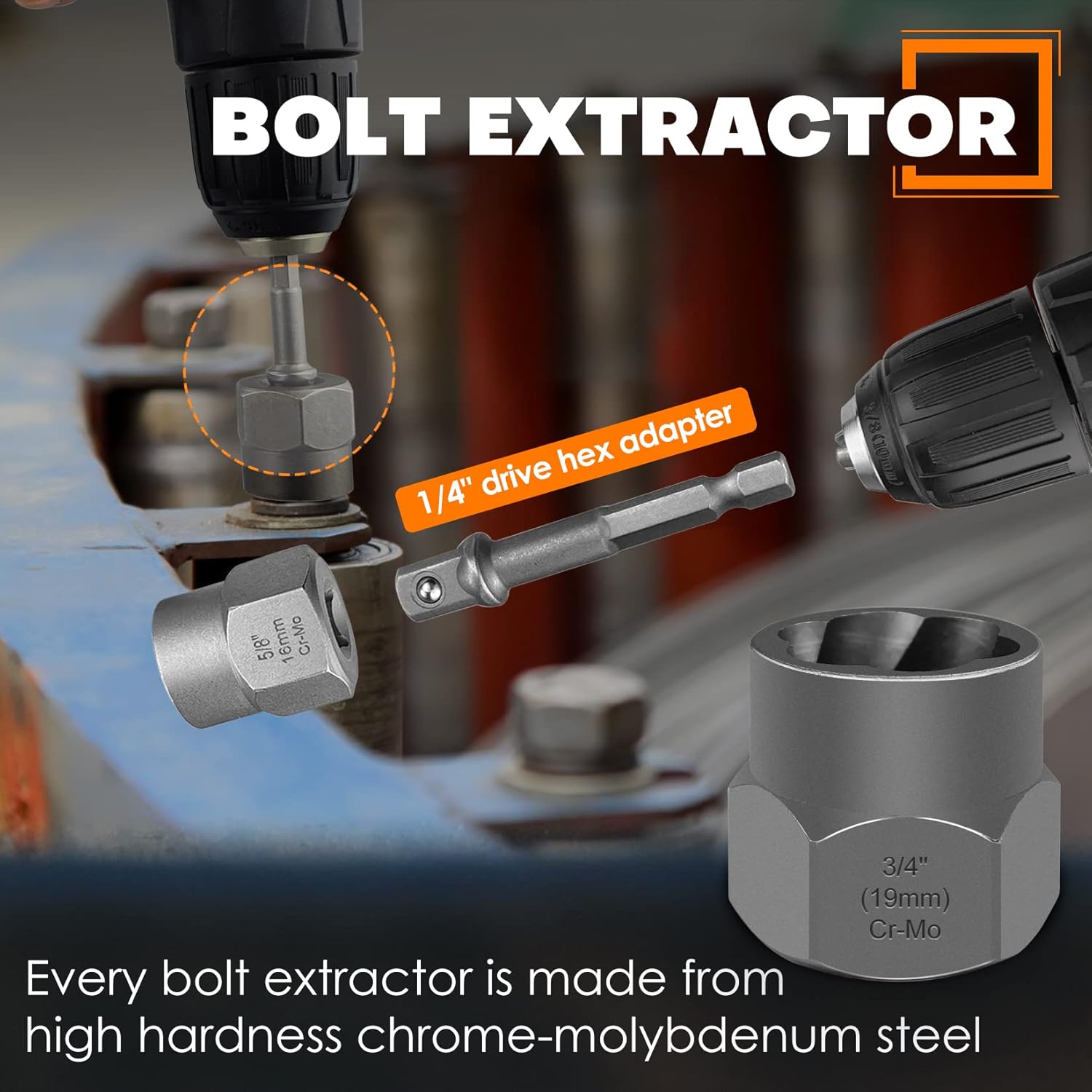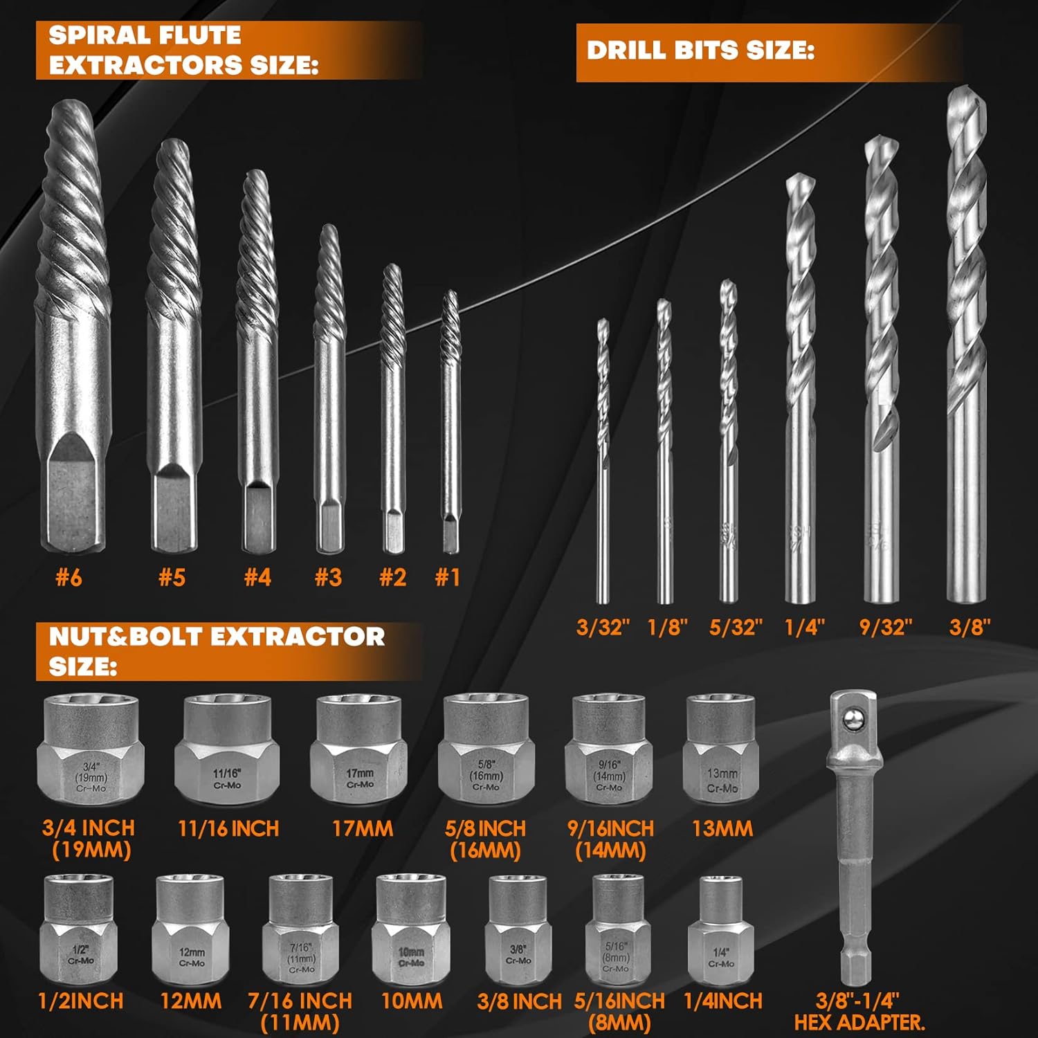 - Especificaciones: el juego de 26 extractores de tornillos y pernos/brocas incluye 6 extractores de flautas en espiral de estilo fácil, 13 extractores de pernos y tuercas, 1 adaptador hexagonal de 1/4 pulgadas y 6 brocas de taladro.