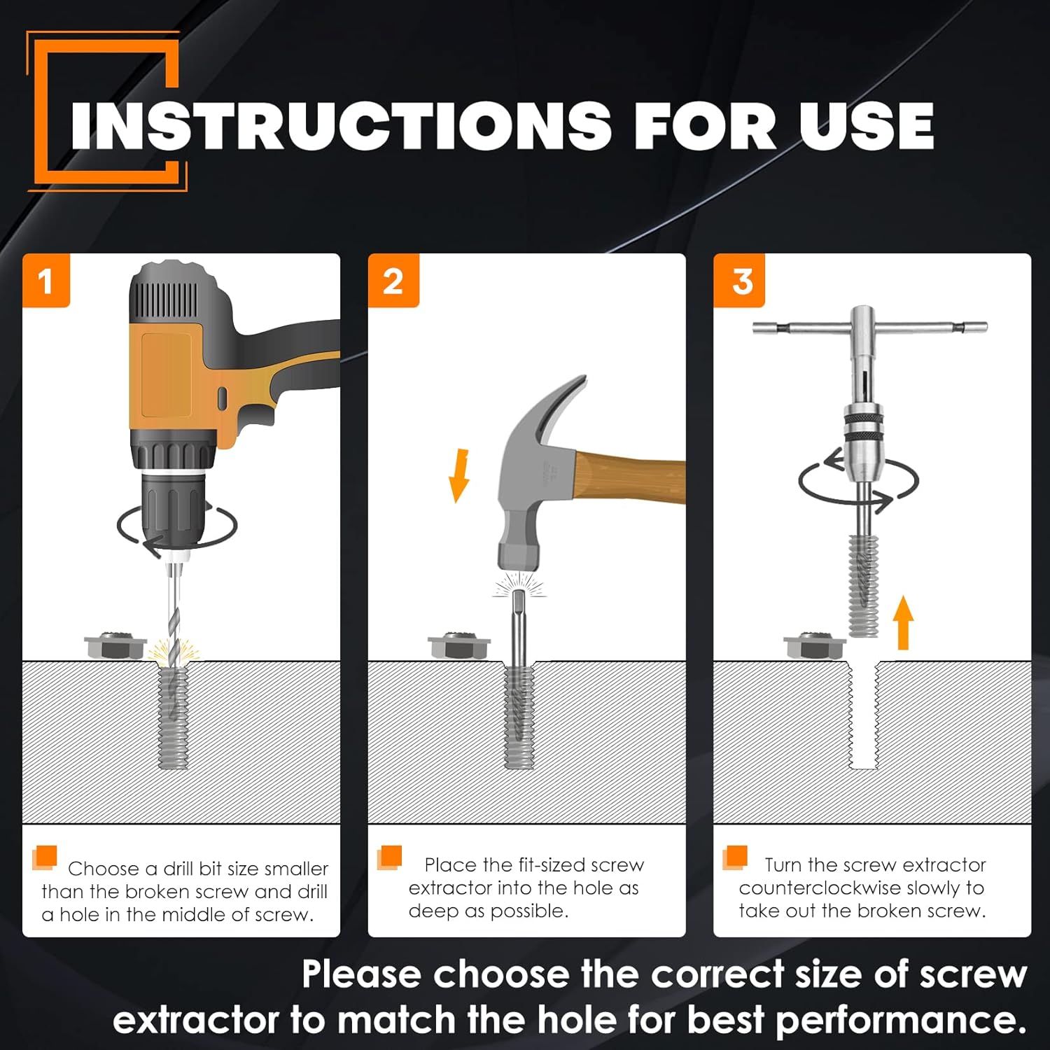 - Función: los extractores de flautas en espiral son perfectos para sujetadores comunes, los extractores de pernos son para liberar sujetadores parcialmente expuestos. El kit también incluye brocas de cobalto a mano derecha para sujetadores, que se pueden utilizar para ayudar a perforar estos sujetadores.