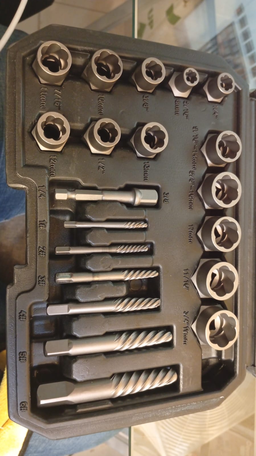 - [Tamaño] Tamaño del extractor de tuercas y pernos: 1/4 pulgadas, 5/16 pulgadas (0.315 in), 3/8 pulgadas, 0.394 in, 7/16 pulgadas (0.433 in), 0.472 in, 1/2 pulgadas, 0.512 in, 9/16 pulgadas (0.551 in), 5/8 pulgadas (0.630 in), 0.669 in, 11/16 pulgadas, 3/4 pulgadas (0.748 in), incluido 3/8 "-1/4" adaptador hexagonal. Extractores de flauta espiral Tamaño: 1#, 2#, 3#, 4#, 5#, 6#. Tamaño de las brocas: 3/32", 1/8", 5/32", 1/4", 9/32", 3/8".
