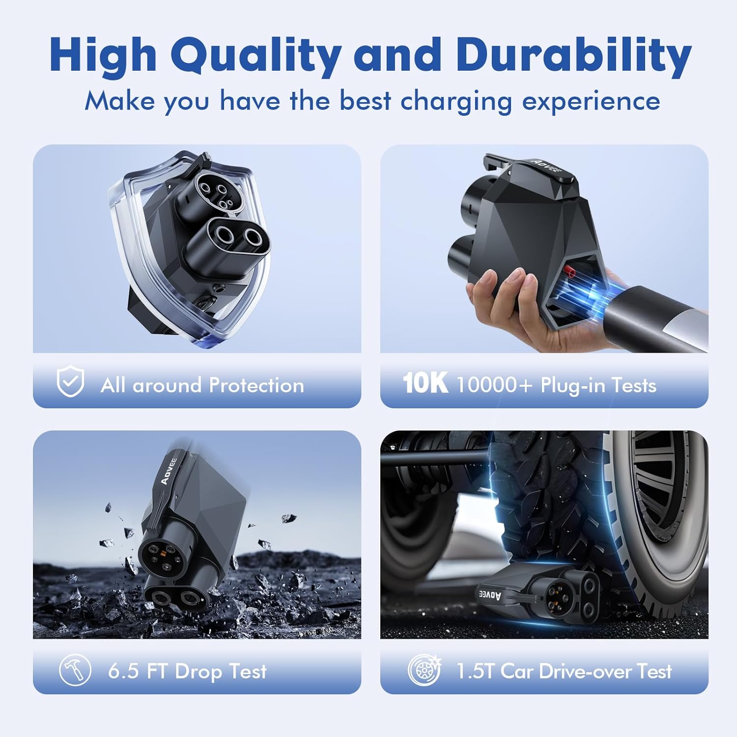 - Protección de seguridad: con una clasificación de impermeabilidad IP54 y alta retardancia de llama, este conector de carga EV tiene un monitoreo de temperatura integrado. La potencia de carga del adaptador de hasta 50 °C disminuirá, hasta 140 °F (60 °C) se apagará.