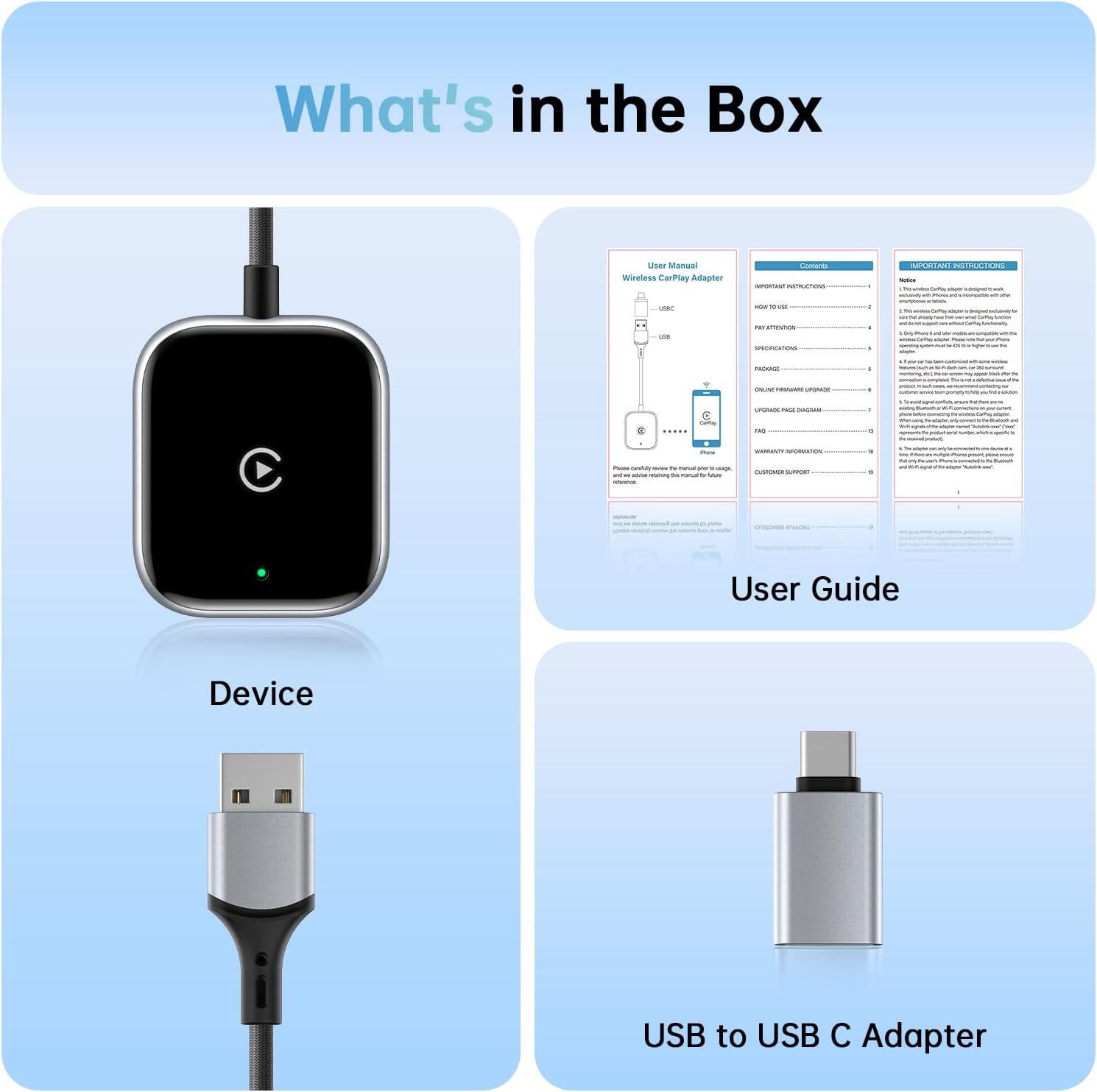 - Elimina la frustración de las caídas de conexión con nuestro fiable adaptador inalámbrico CarPlay, asegurando una conexión fuerte y constante que te permite mantenerte concentrado en la carretera. Disfruta de tiempos de respuesta rápidos y cero retrasos al interactuar con CarPlay inalámbrico. Ya sea que sigas instrucciones o gestiones tus listas de reproducción, el adaptador garantiza que tu CarPlay funcione al instante y sin interrupciones.