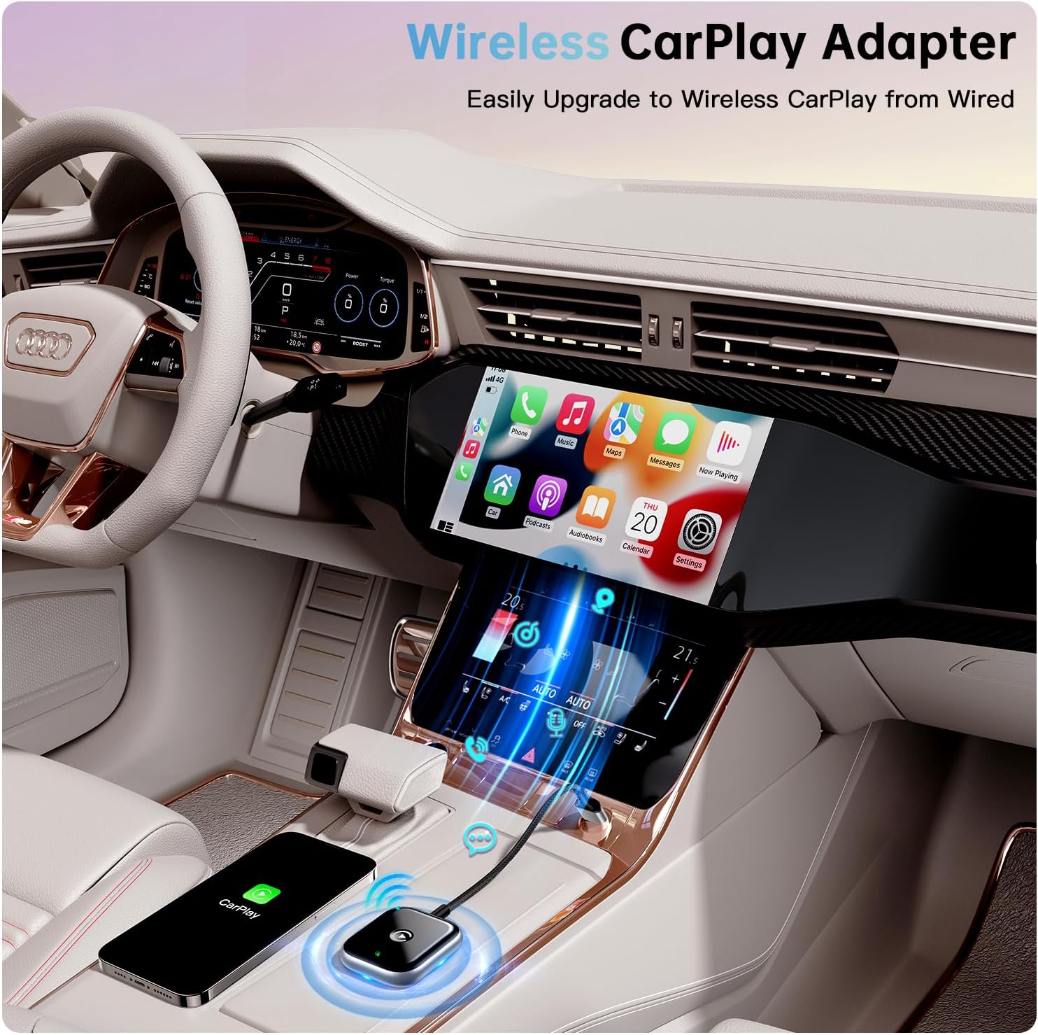 - Conexión inalámbrica ultrarrápida: obtén acceso rápido a tus funciones favoritas de CarPlay como navegación, música, mensajes, llamadas telefónicas, asistente Siri, etc. Nuestro adaptador CarPlay utiliza tecnología inalámbrica de vanguardia para proporcionar una conexión inmediata al sistema de información y entretenimiento de tu vehículo, ofreciendo un rendimiento que supera a otros adaptadores inalámbricos. Plug and play, con soporte para reconexión automática, configúrelo una vez y benefíciese de toda la vida.