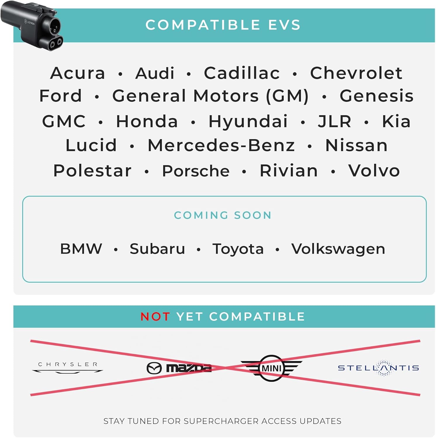- Compatibilidad exclusiva: nuestro adaptador NACS a CCS está diseñado exclusivamente para CCS1 EVs a los que se les ha concedido acceso a la red Tesla Supercharging. Los EVs que no son Tesla pueden utilizar supercargadores de alta velocidad una vez que acceden a su fabricante de automóviles.