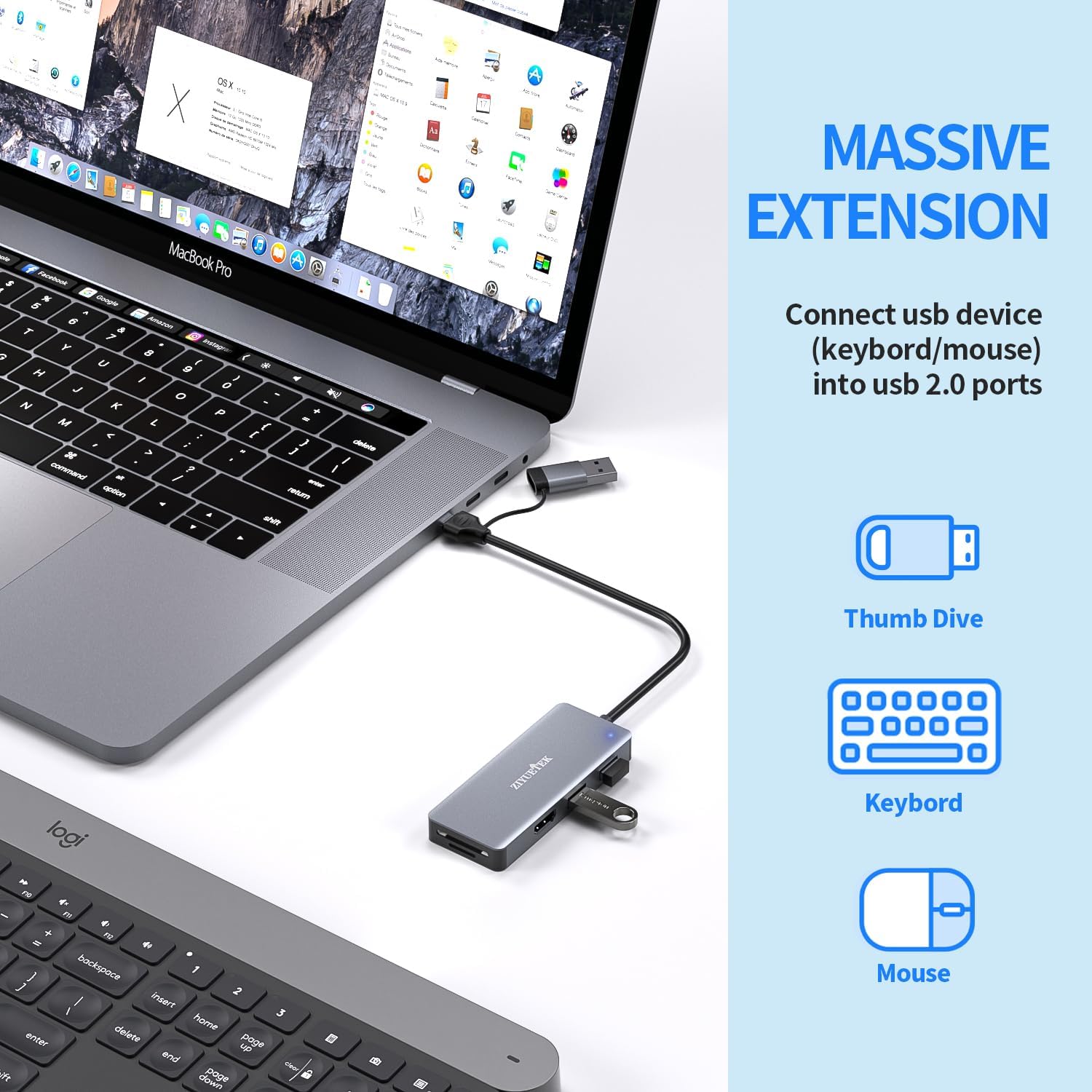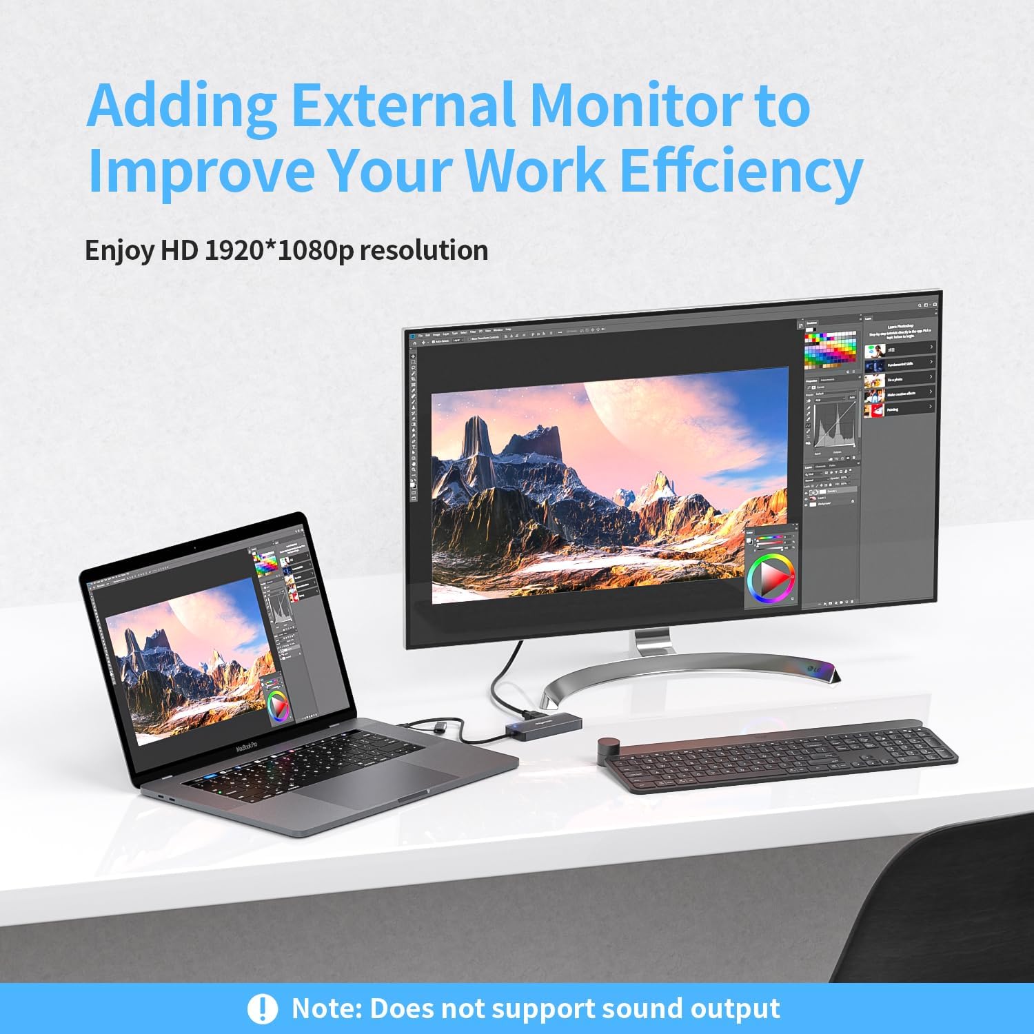 - No solo HDMI: Además del puerto HDMI, este adaptador también viene con un HUB con dos puertos USB2.0, adecuado para dispositivos USB como teclados, ratones e impresoras. Al mismo tiempo, la carcasa de aluminio también permite transportarla sin preocuparse por el sobrecalentamiento debido a un funcionamiento a largo plazo. Es importante tener en cuenta que este adaptador debe estar conectado a un puerto USB 3.0 o superior para que funcione correctamente.