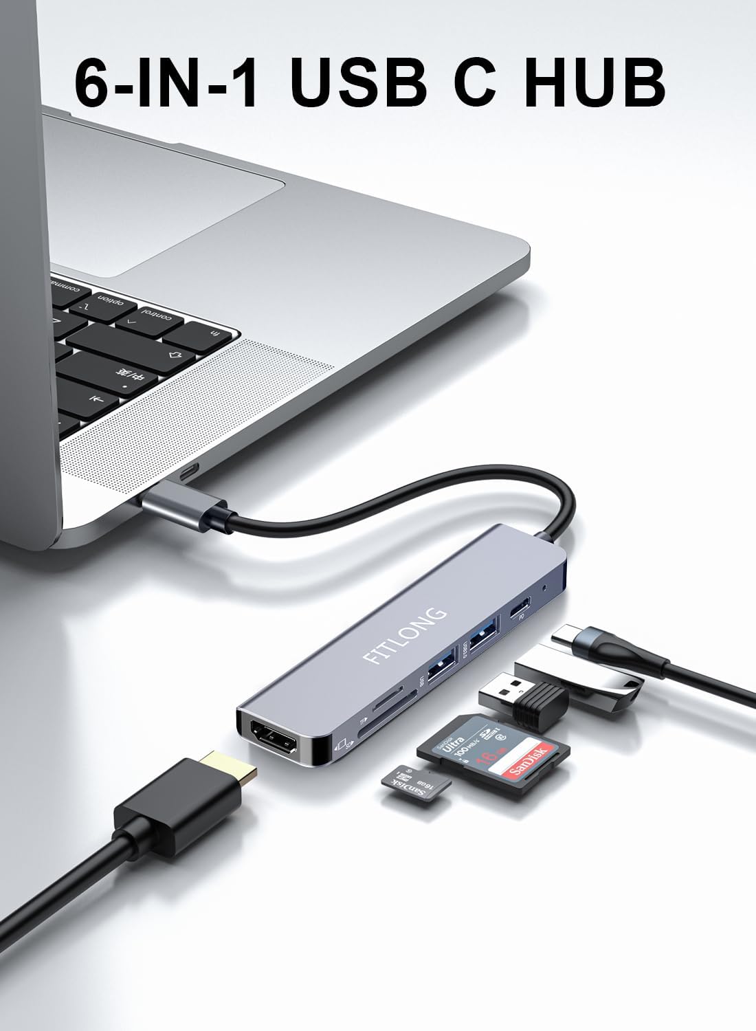 - Múltiples funciones - 6 en 1: El concentrador USB C FITLONG combina 6 de los puertos más utilizados con 1 puerto HDMI 4K, 2 puertos USB 3.0, 1 puerto de carga PD, ranuras para tarjetas SD/microSD/TF y concentrador tipo C de enchufe. Las unidades sin tener que configurar 6 puertos para conectarse simultáneamente, cumplen con todos los requisitos de su negocio y mejoran la eficiencia de su trabajo le permiten