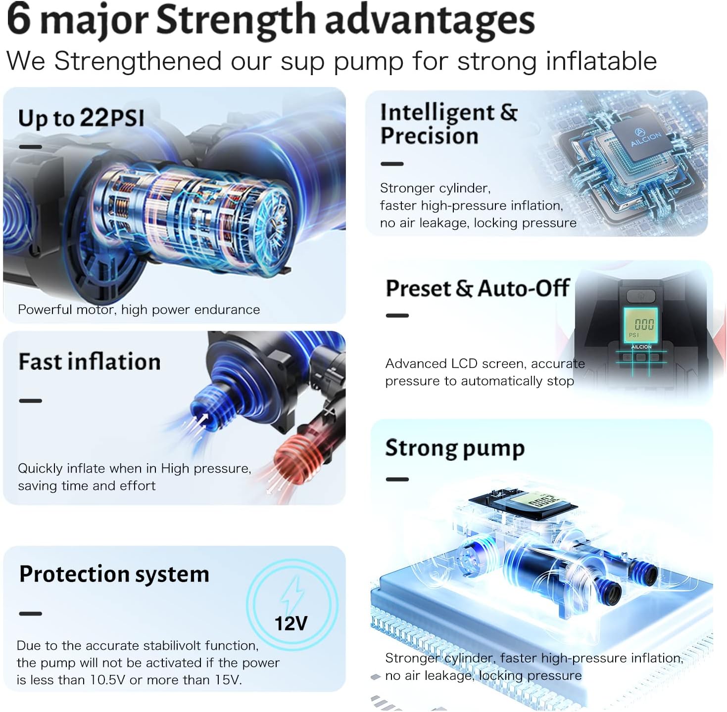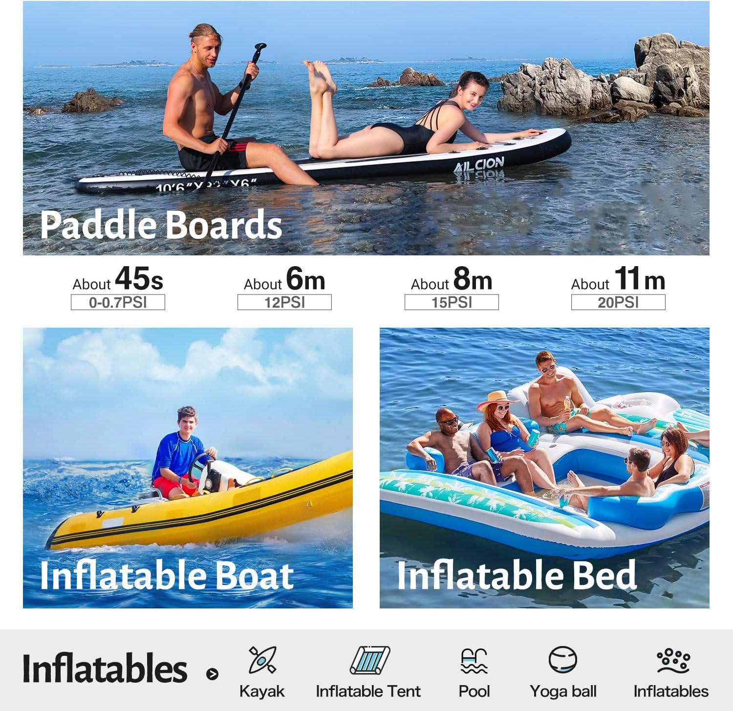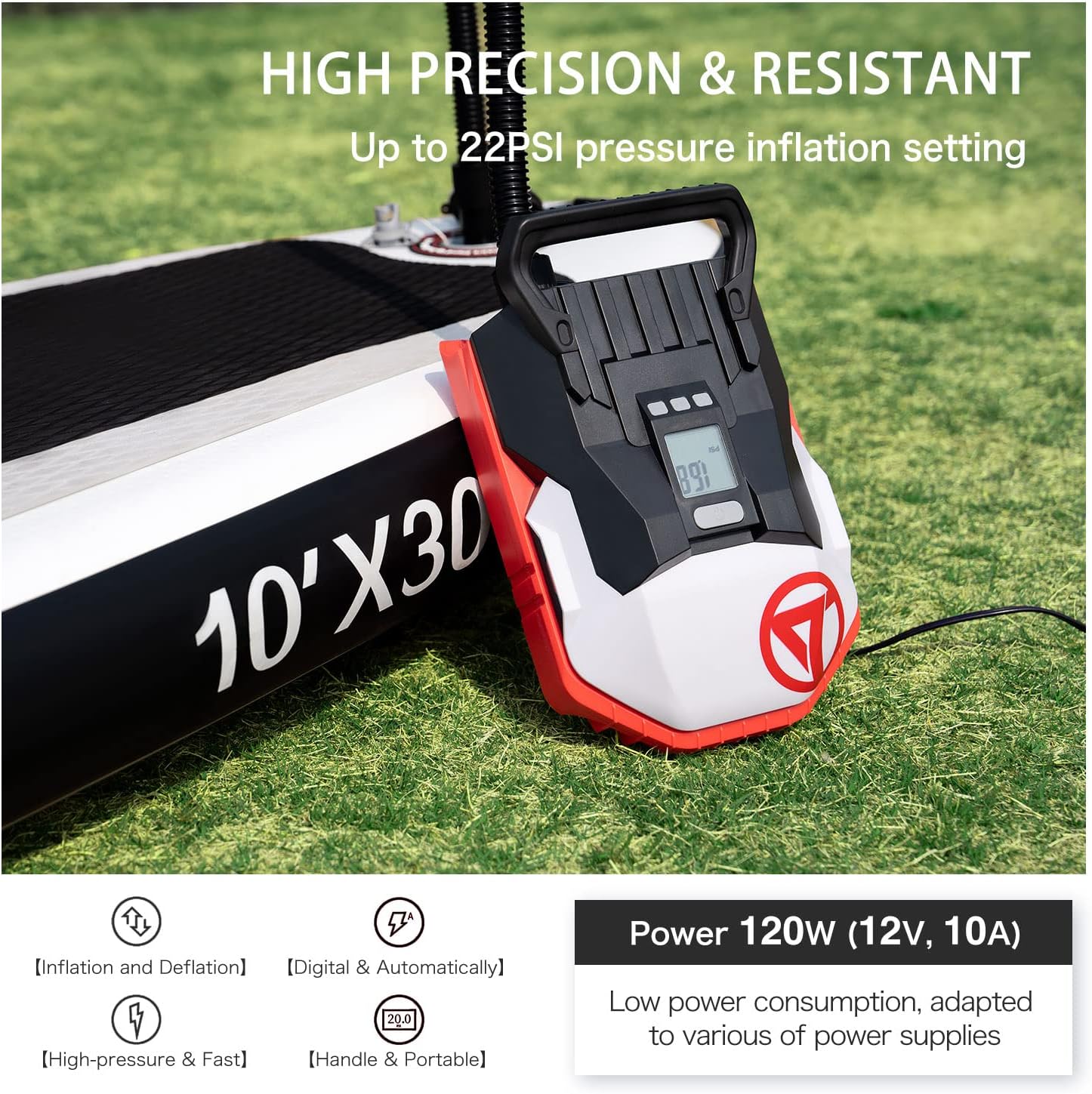 - Presión: 0.7-22 PSI, potente bomba de aire eléctrica portátil que puede inflar una tabla de paletas de 10 pies de 0 a 15 PSI en 9 minutos. Hasta 20 PSI en 13 minutos.