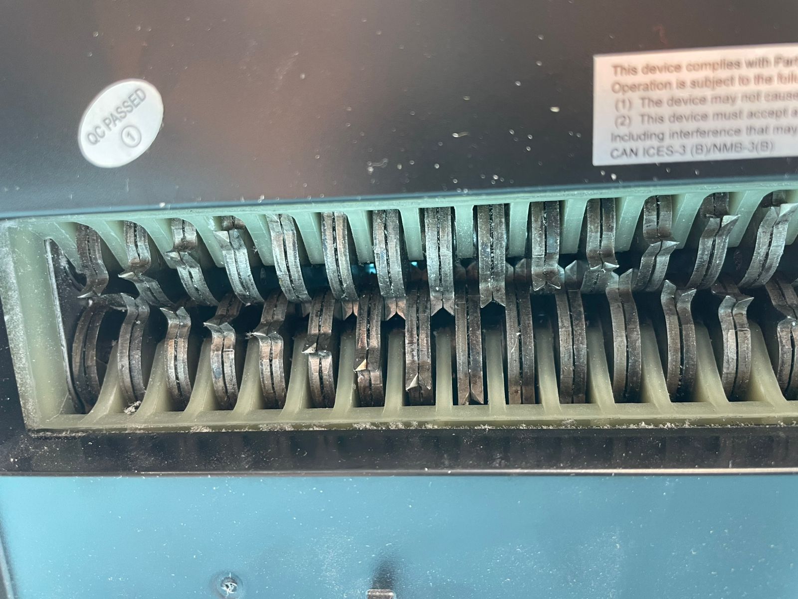 - Tritura hasta 12 hojas de papel de carta de 9 kg a la vez; también puede triturar tarjetas de crédito (de a una, pero no admite tarjetas de crédito de metal), grapas, y clips pequeños para papel
