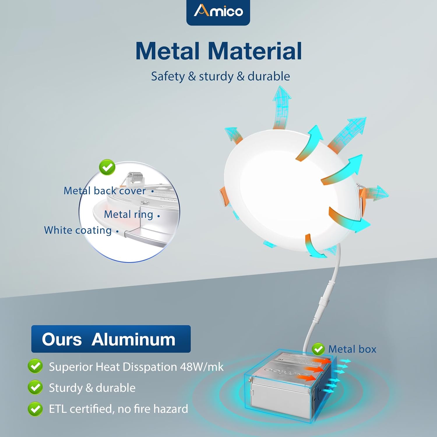 - Clasificación IC: La luz LED empotrable de Amico tiene clasificación IC. Esto permite que esté en contacto con los aislamientos de los techos, lo que significa que la caja de conexiones está protegida térmicamente. Requiere espacio en el techo de tan solo 2 pulgadas, se adapta a diferentes techos y vigas. No provocará incendios en el techo ni en el espacio encima de la viga.