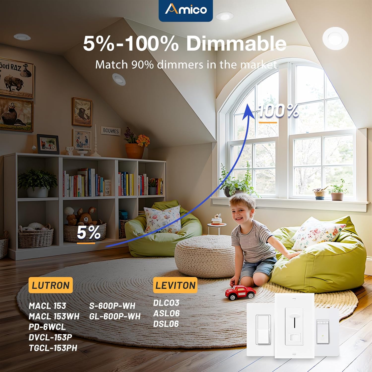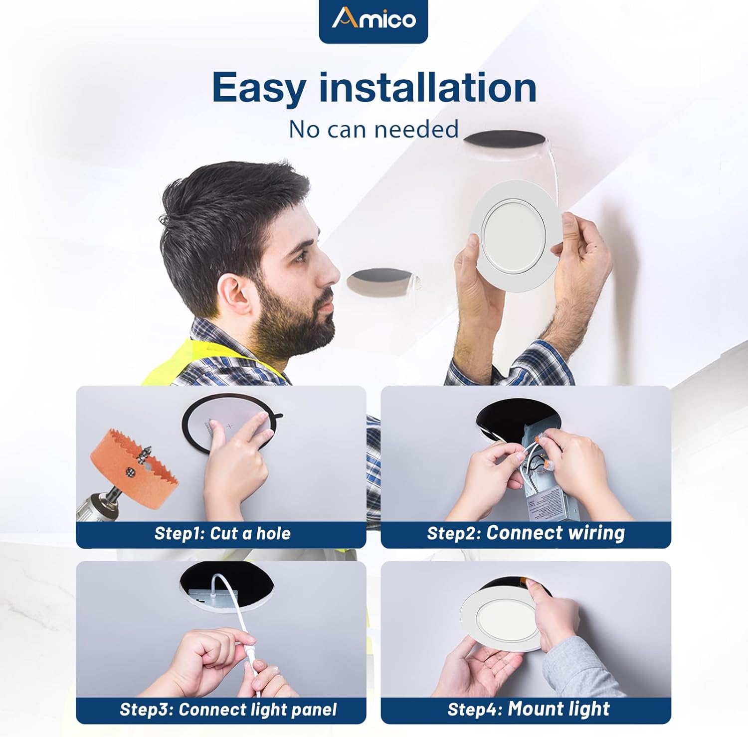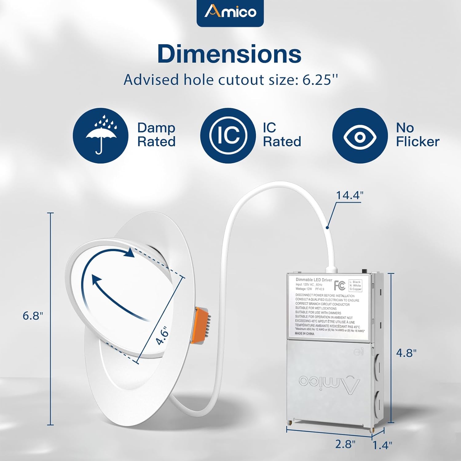 - Clasificación IC: la luz empotrada LED sin lata de Amico tiene clasificación IC, lo que permite estar en contacto con aislamientos en techos, lo que significa que la caja de conexiones está térmicamente protegida. Solo requiere espacios de techo tan pequeños como de 2 pulgadas, se adapta a varios techos y vigas. No causará un incendio en el techo ni en el espacio de la vigueta superior.