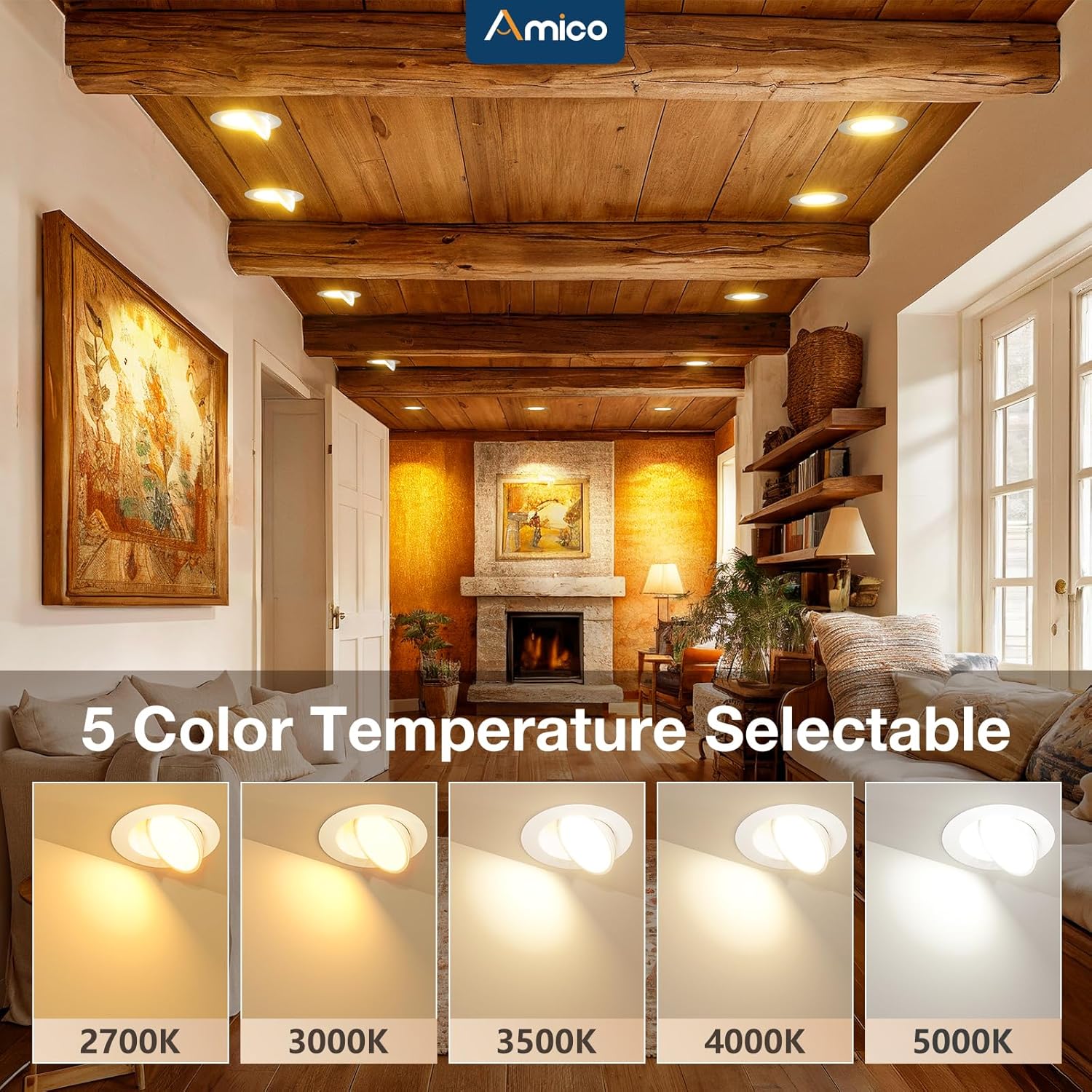 Amico Paquete de 12 luces LED empotrables de techo con cardán 5CCT de 6 pulgadas, luces direccionales de globo ocular ajustables , luz descendente de oblea regulable con Jbox, 12 W, 1200.