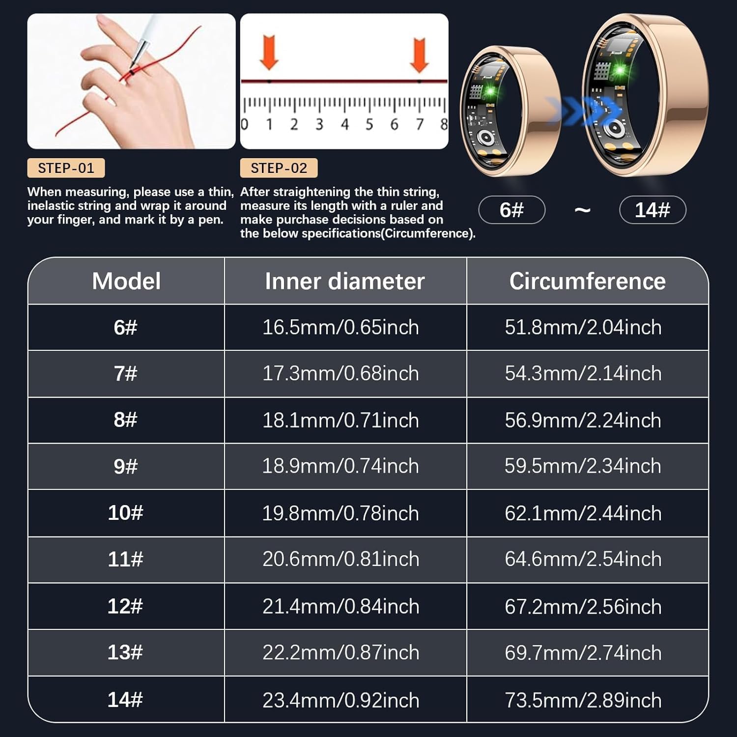 - El anillo inteligente KNGAD sigue las normas de tallas de anillo de Estados Unidos. Si ya conoces el tamaño de tu anillo de EE. UU., puedes pedir el anillo de seguimiento de salud del mismo tamaño. Si no conoces el tamaño de tu anillo de EE. UU., te recomendamos encarecidamente que revises la guía de tallas de los anillos de EE. UU., mide la circunferencia de tu dedo y usarla para determinar tu ajuste perfecto.