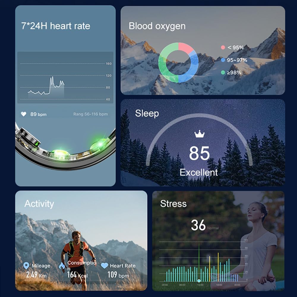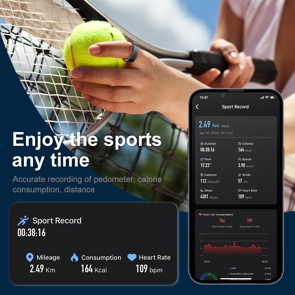 - Seguimiento deportivo completo: Este anillo inteligente registra con precisión tus datos de actividad a lo largo del día. Calcula tus pasos, distancia recorrida, calorías quemadas y fluctuaciones de la frecuencia cardíaca durante el ejercicio. Además, ofrece diversos modos deportivos, como caminar, correr, ciclismo y diversas actividades en interiores y exteriores.