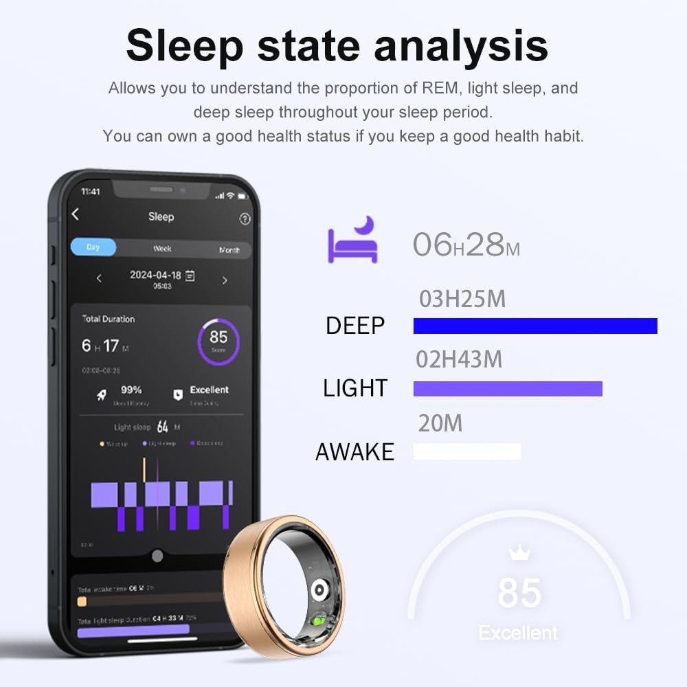 - Monitor de salud: Este anillo inteligente utiliza tecnología de sensor óptico para monitorizar la frecuencia cardíaca y la saturación de oxígeno en sangre, lo que proporciona datos intuitivos para tu salud. Al caer la noche, el sensor de gravedad integrado calcula tu tiempo de sueño según tu frecuencia de movimiento y te proporciona información sobre la calidad del sueño como referencia.