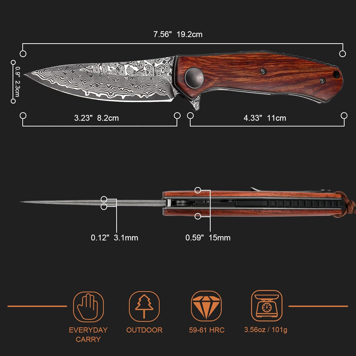 - Alta calidad: la hoja de cuchillo plegable de Damasco se combina con 76 capas de acero al carbono y núcleo de acero VG10, dureza 58-59HRC, asegurando una funcionalidad completa y durabilidad.