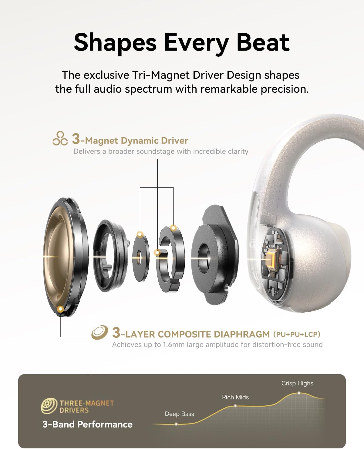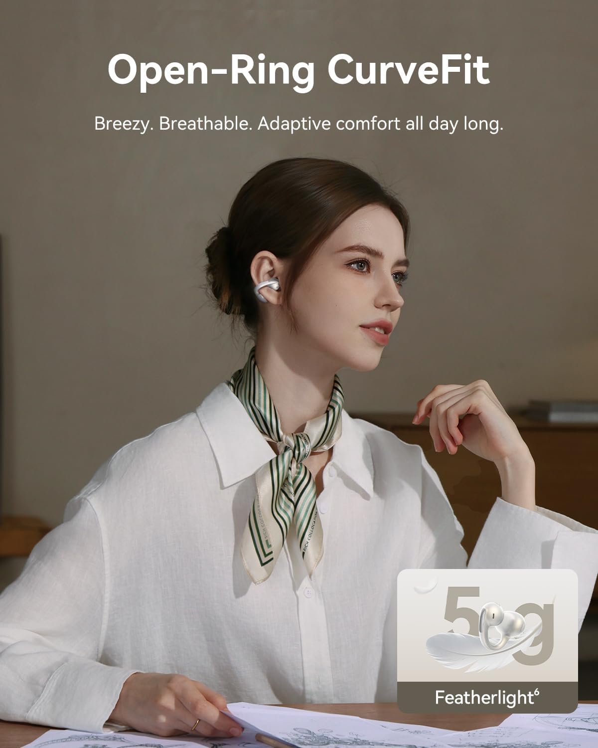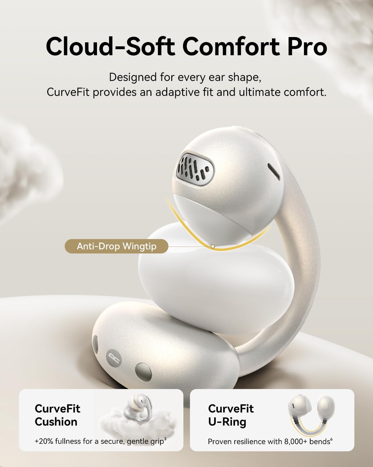 - Comodidad con clip para todo el día: Los auriculares con clip de anillo abierto cuentan con cojines CurveFit ultrasuaves y resistentes, puntas de alas anti-caída y un anillo en U flexible de TPU con alambre de titanio con memoria probado para más de 8.000 curvas. Con solo 5 g, estos auriculares de oreja abierta están diseñados para ofrecer un ajuste transpirable, adaptable y seguro con comodidad similar a la nube para varias formas de oreja sin irritación ni presión.