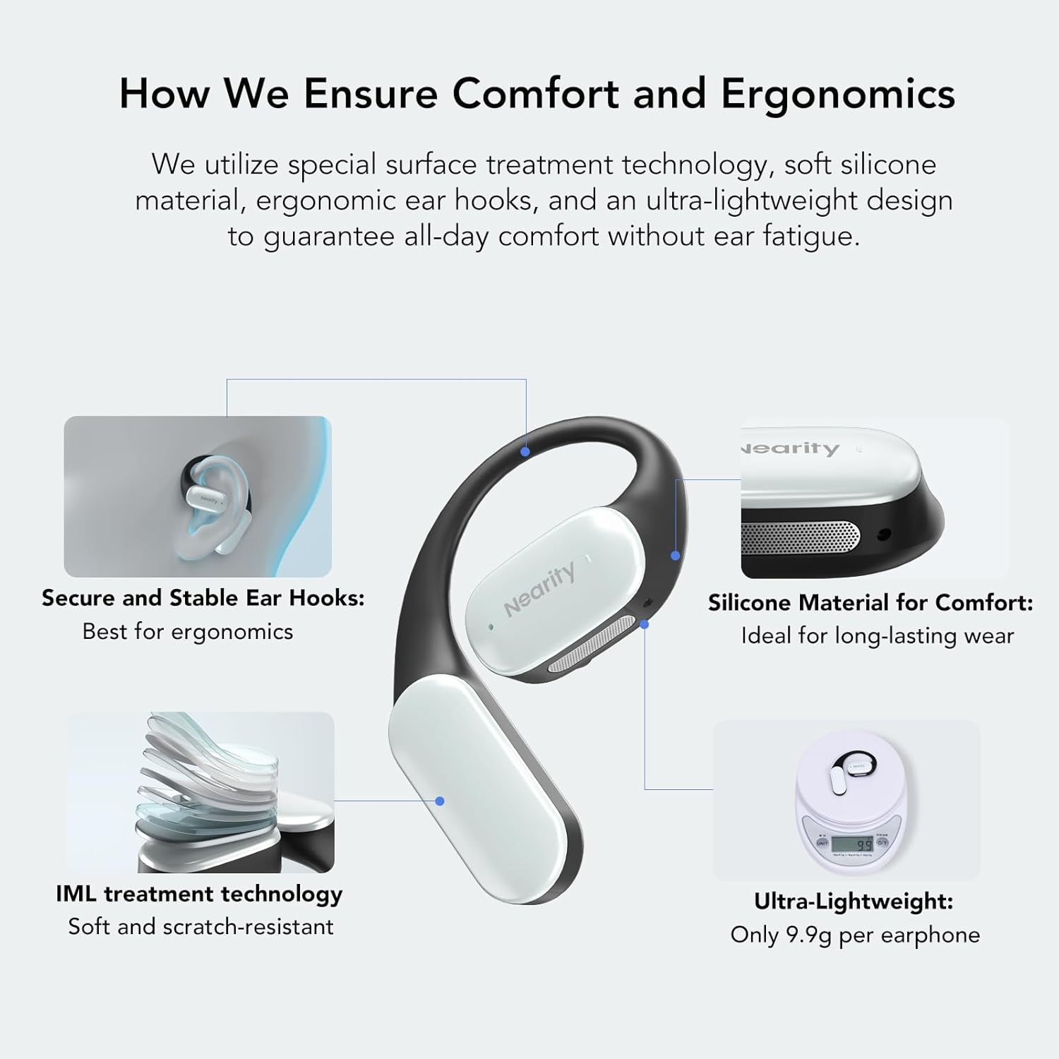 - Silicona suave y diseño ergonómico: los auriculares de oreja abierta están fabricados con material de silicona agradable al tacto, asegurando un tacto sedoso y una experiencia cómoda. Diseñado para adaptarse a los contornos naturales de tus orejas, el diseño ergonómico proporciona un ajuste seguro y cómodo. Con un peso de solo 0.35 oz, estos auriculares son increíblemente ligeros, no causarán ninguna presión en tus oídos, incluso después de usarlos todo el día, ya sea que estés participando en deportes, viajes o asistiendo a reuniones.