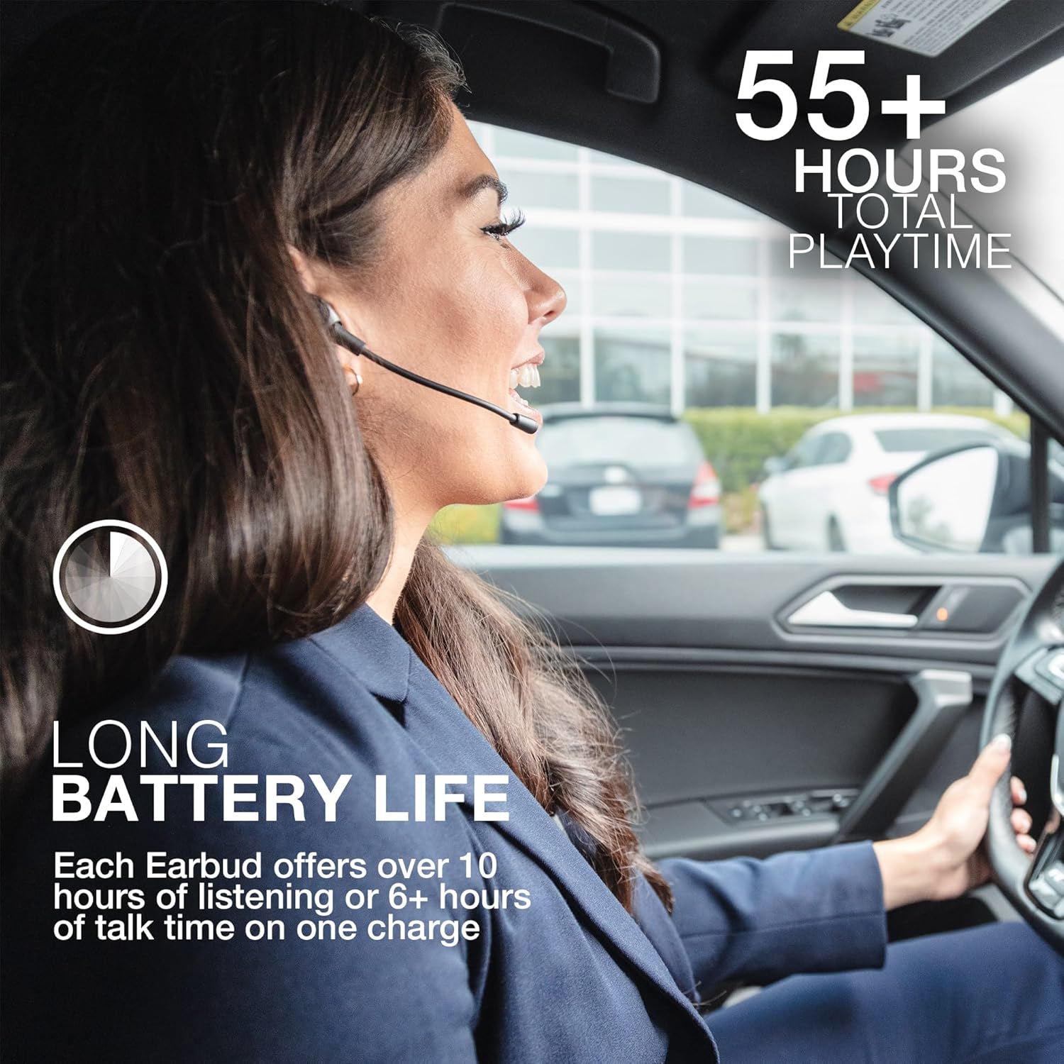 - BATERÍA DE LARGA DURACIÓN: Los auriculares Work Buds True Wireless cuentan con un tiempo de reproducción prolongado de más de 55 horas en total. Disfrute de su música, podcasts o responda llamadas durante períodos prolongados sin tener que preocuparse por quedarse sin batería. Los auriculares tienen un tiempo de reproducción de más de 10 horas por carga única para escuchar o más de 6 horas de conversación. Con su base de carga, puedes recargar fácilmente la batería de los auriculares cuando sea necesario, asegurando que nunca te quedes sin batería cuando más la necesitas.