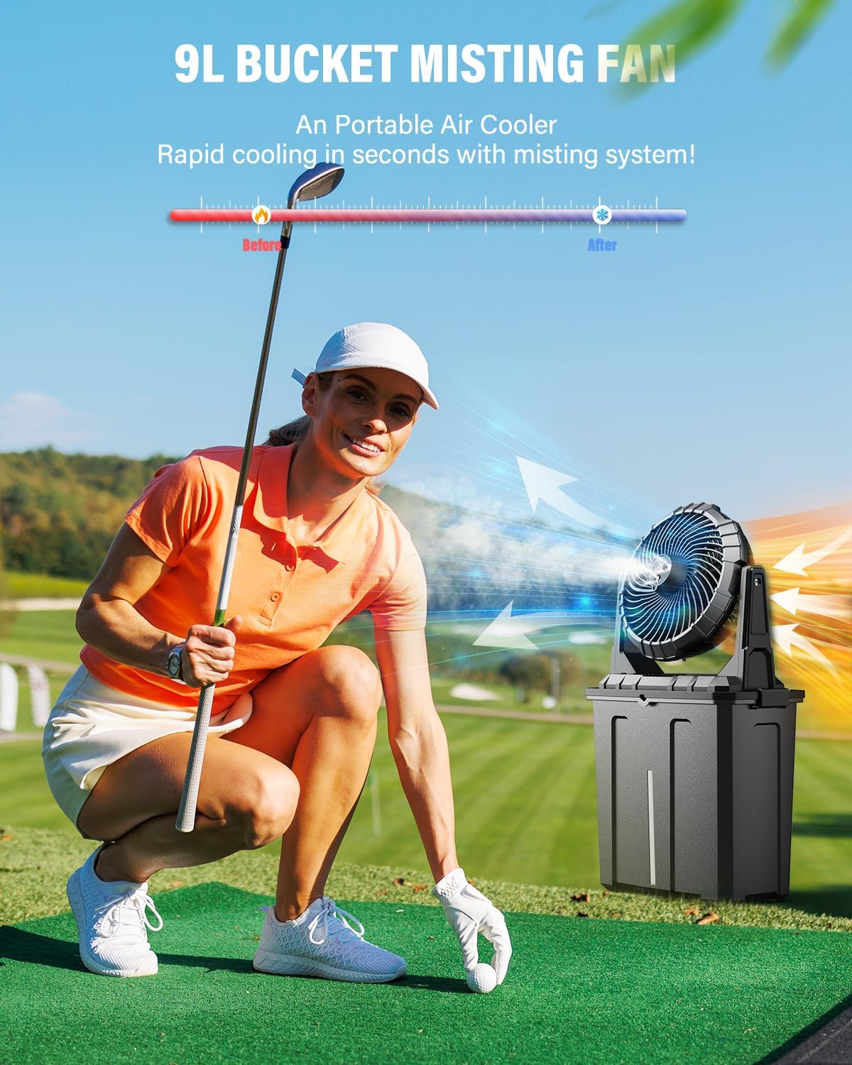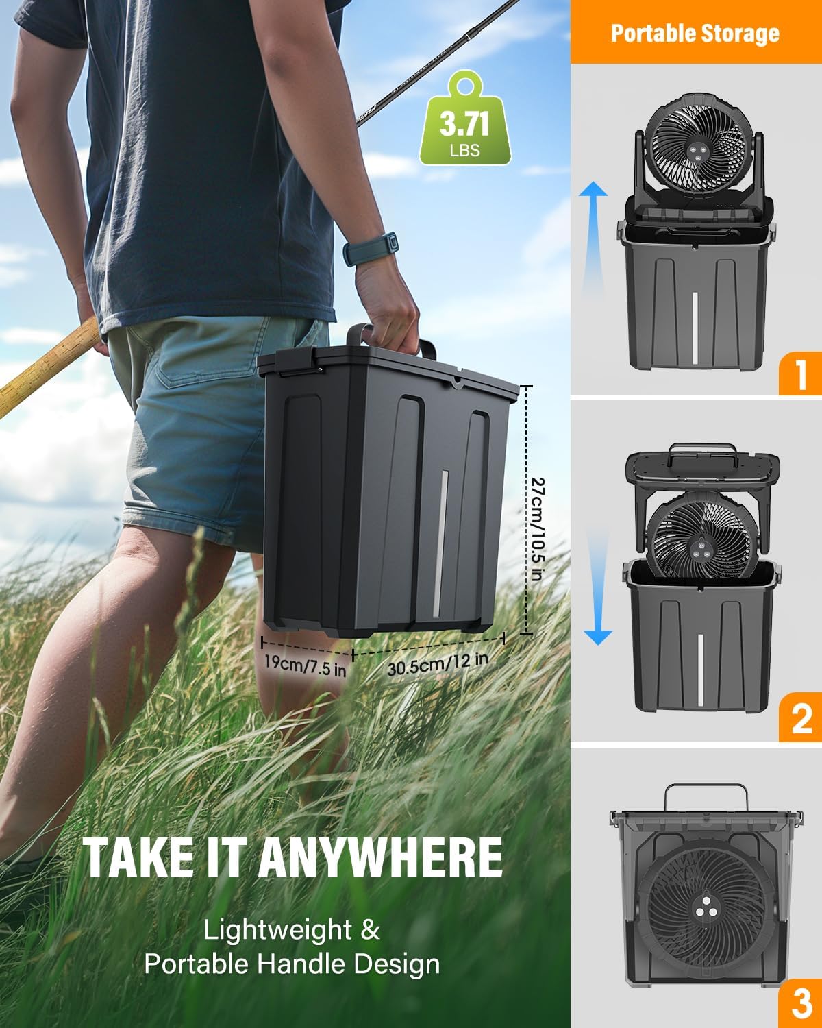 - Cubo portátil de 9 litros: el ventilador portátil recargable viene con un cubo de agua de 9 L, por lo que no necesitas gastar dinero extra para configurar una botella de agua y se puede utilizar tan pronto como lo recibas. El diseño de gran capacidad te permite usarlo durante 5-9 horas después de llenarlo con agua, sin necesidad de añadir agua con frecuencia cada pocos minutos. Cuando no está en uso, el ventilador portátil se puede girar y almacenar en el cubo, por lo que es fácil de almacenar y cómodo de llevar directamente cuando viajas al aire libre.