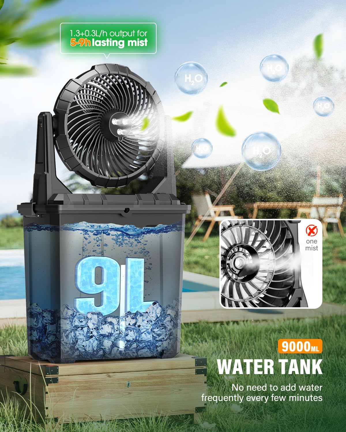 - 20000 mAh y 3 velocidades ajustables: el ventilador de nebulización funciona con pilas utiliza una batería de litio de alto rendimiento de 20000 mAh, que puede proporcionar de 6 a 7 horas (ventilador alto + niebla) o 12-55 horas (solo ventilador) de tiempo de trabajo. El ventilador Mister funciona con un motor sin escobillas de alta potencia con 3 ajustes de velocidad diferentes (débil, fuerte y súper fuerte). Su modo de velocidad de viento más ligero funciona bien para crear una brisa suave y solo hay un mínimo ruido blanco en la tienda durante la noche. Su modo de velocidad de viento más fuerte puede enfriar a un grupo!