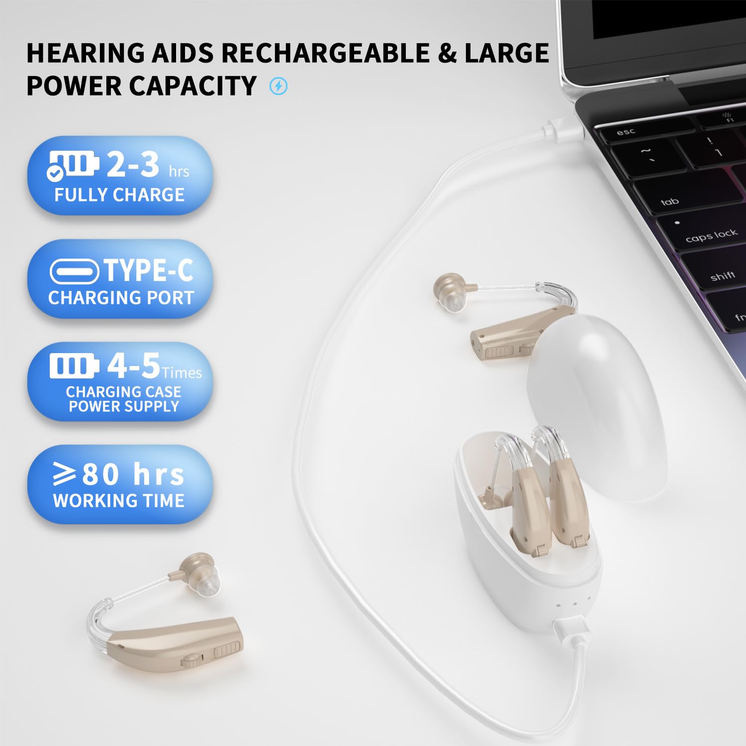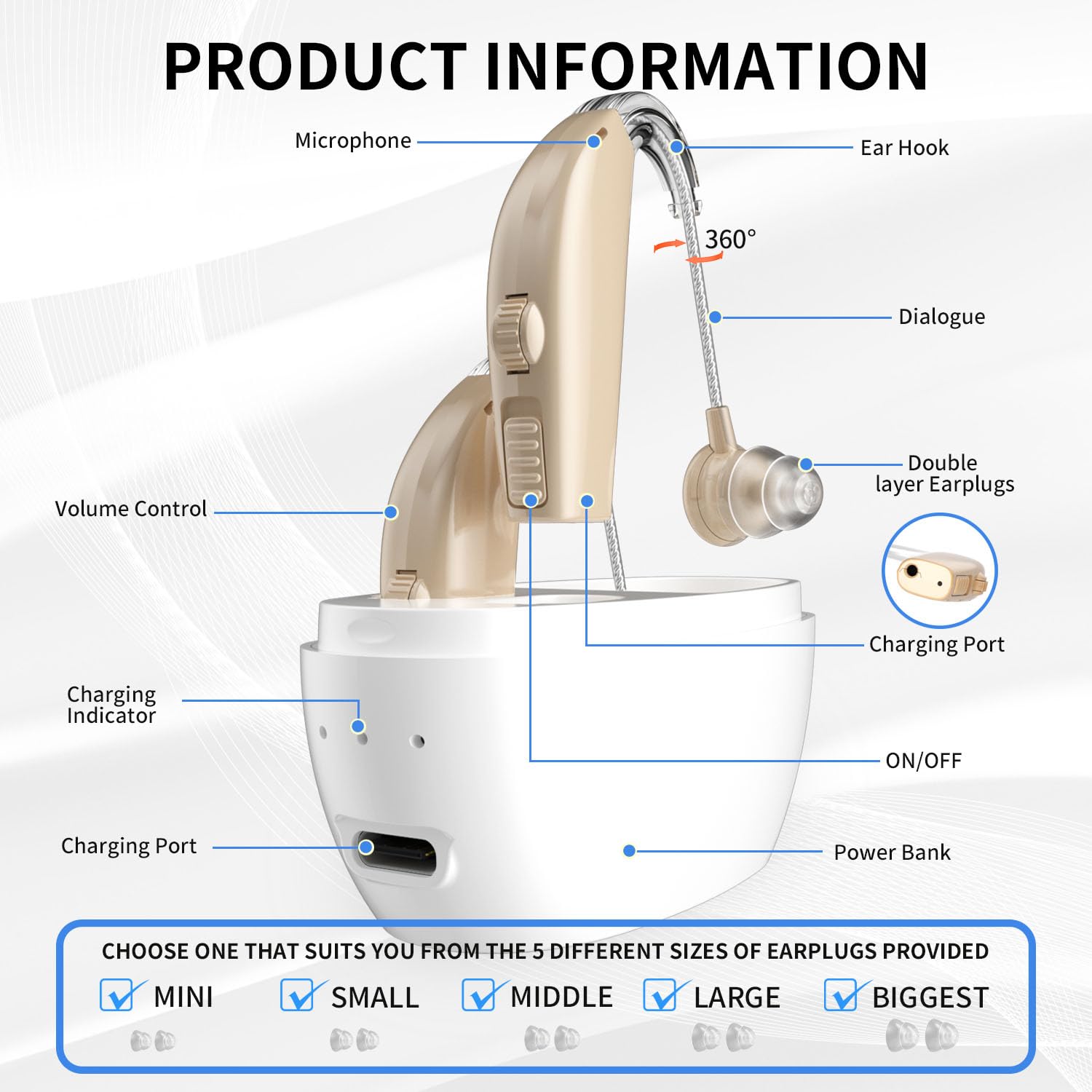 - Audífonos recargables: Son audífonos recargables por USB que se colocan en la base para una carga inalámbrica sin necesidad de cambiar la batería con frecuencia. Este audífono para personas mayores se carga rápidamente en 2-3 horas y funciona hasta 20 horas. Es perfecto para usar todo el día.