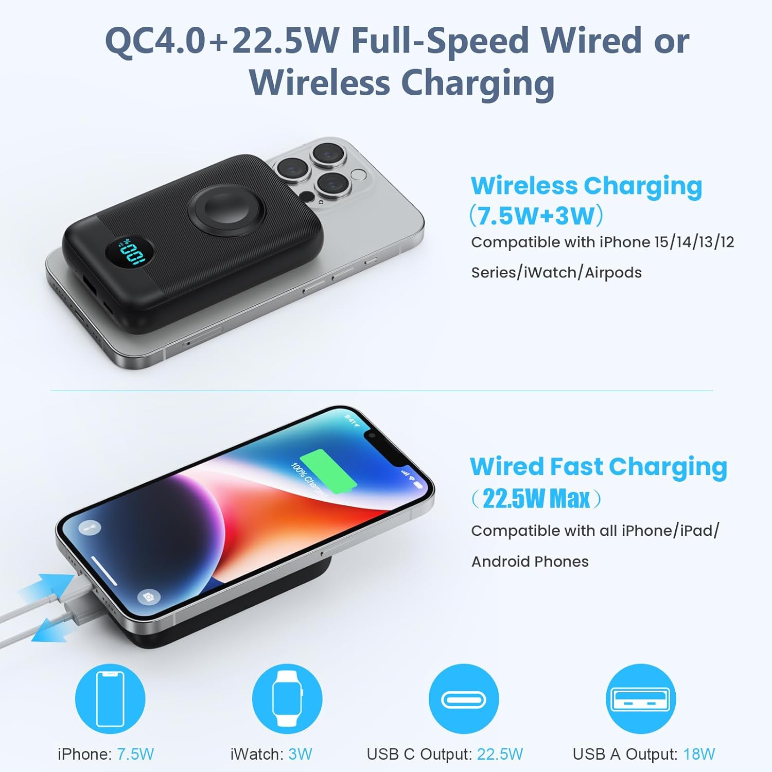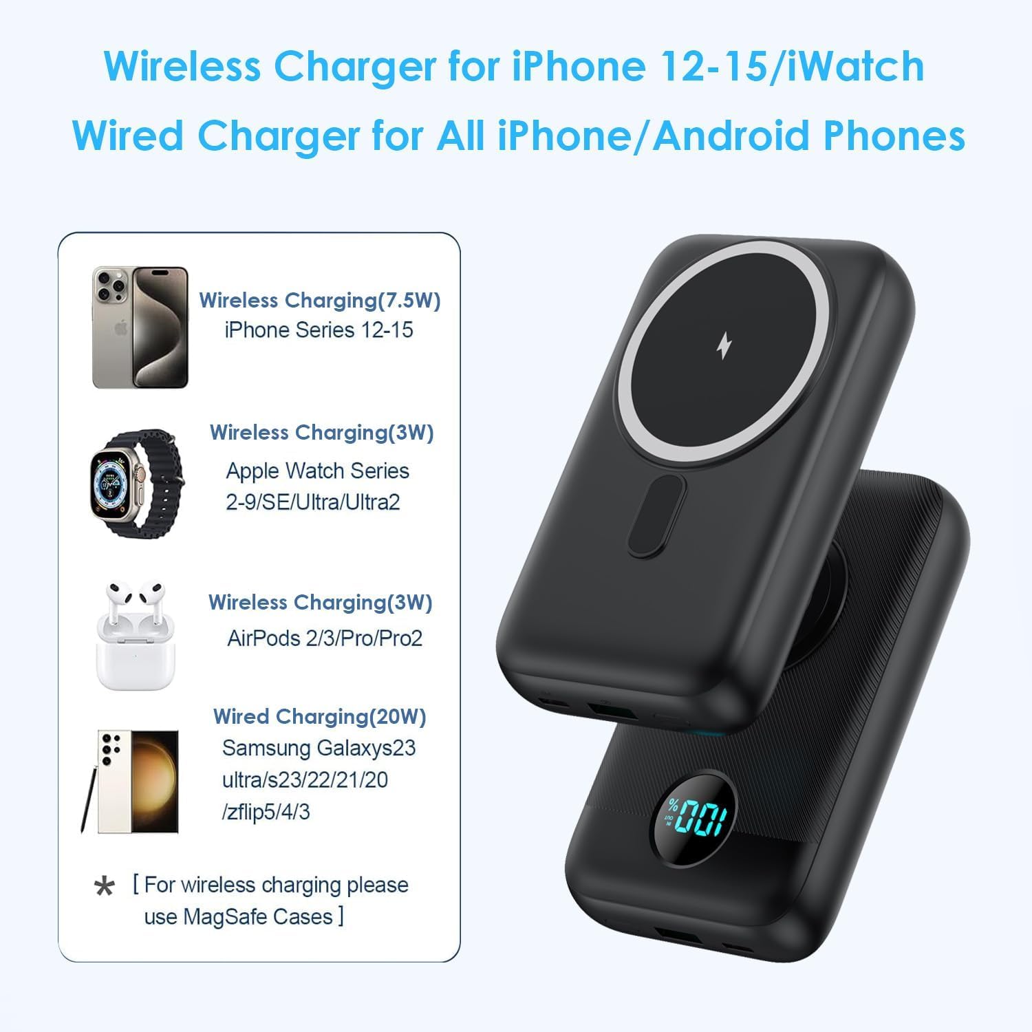 - El banco de energía Pxwaxpy admite carga magnética para funda magnética MagSafe, iPhone 16/16 Plus/16 Pro/16 Pro Max/15/15 Plus/15 Pro/15 Pro/15 Pro Max/14/14 Plus/14 Pro/14 Pro Max/13/13 mini/13 Pro/13 Pro Max/12/12 mini/12 Pro/12 Pro/12 Pro Max; Carga inalámbrica para Apple Watch 9/8/7/6/5/4/3/2/Ultra2/Ultra1/SE; Carga por cable con salidas USB C/USB A para todos los teléfonos iPhone/i Pad/Samsung/Android y otros dispositivos USB.
