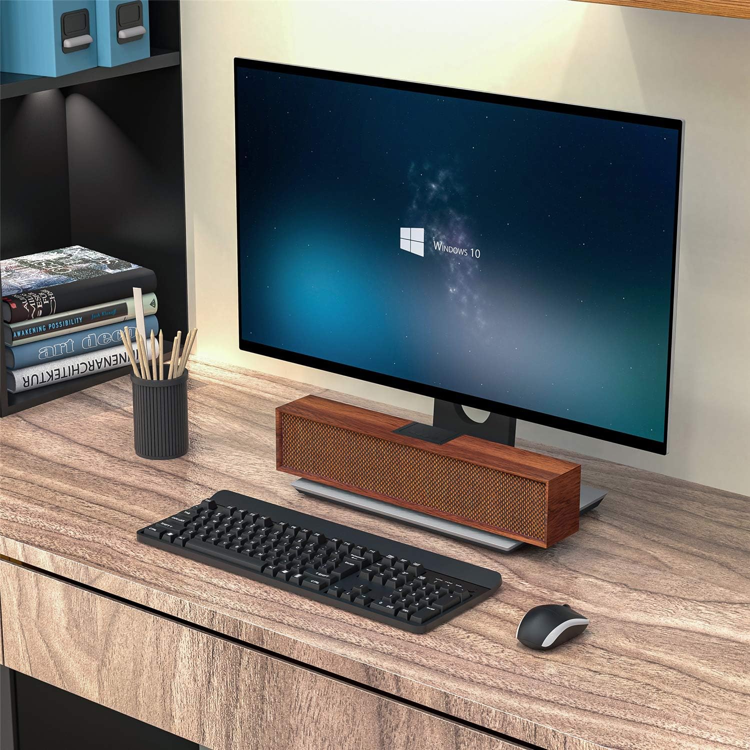 - Ahorra espacio en el escritorio: El diseño de altavoces Bluetooth integrados para PC ahorra espacio debajo de la pantalla. Libera espacio en el escritorio, elimina el desorden de cables y mantén tu escritorio más ordenado. Puedes moverte a cualquier lugar, el alcance de la conexión Bluetooth es de 10 metros.