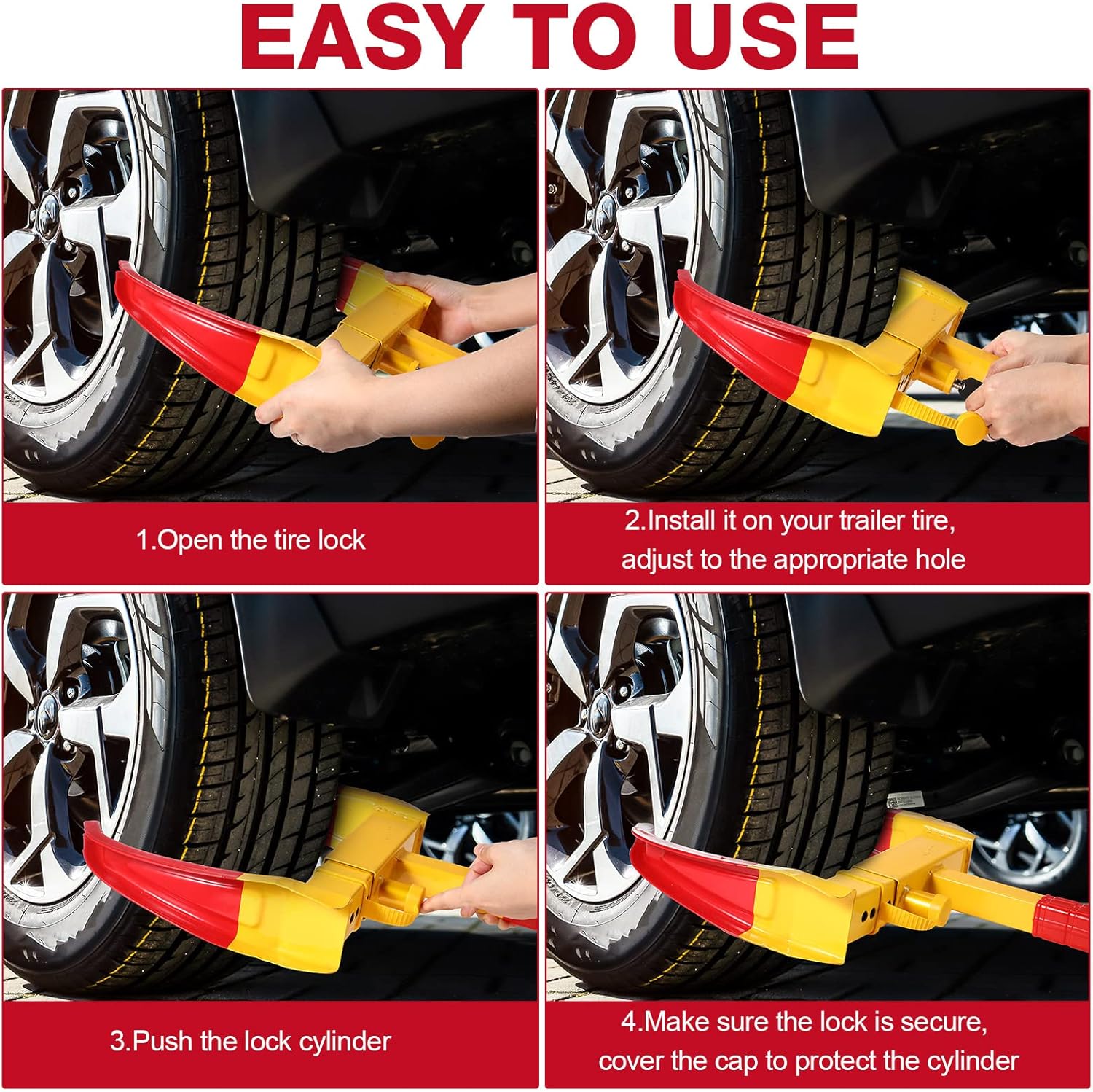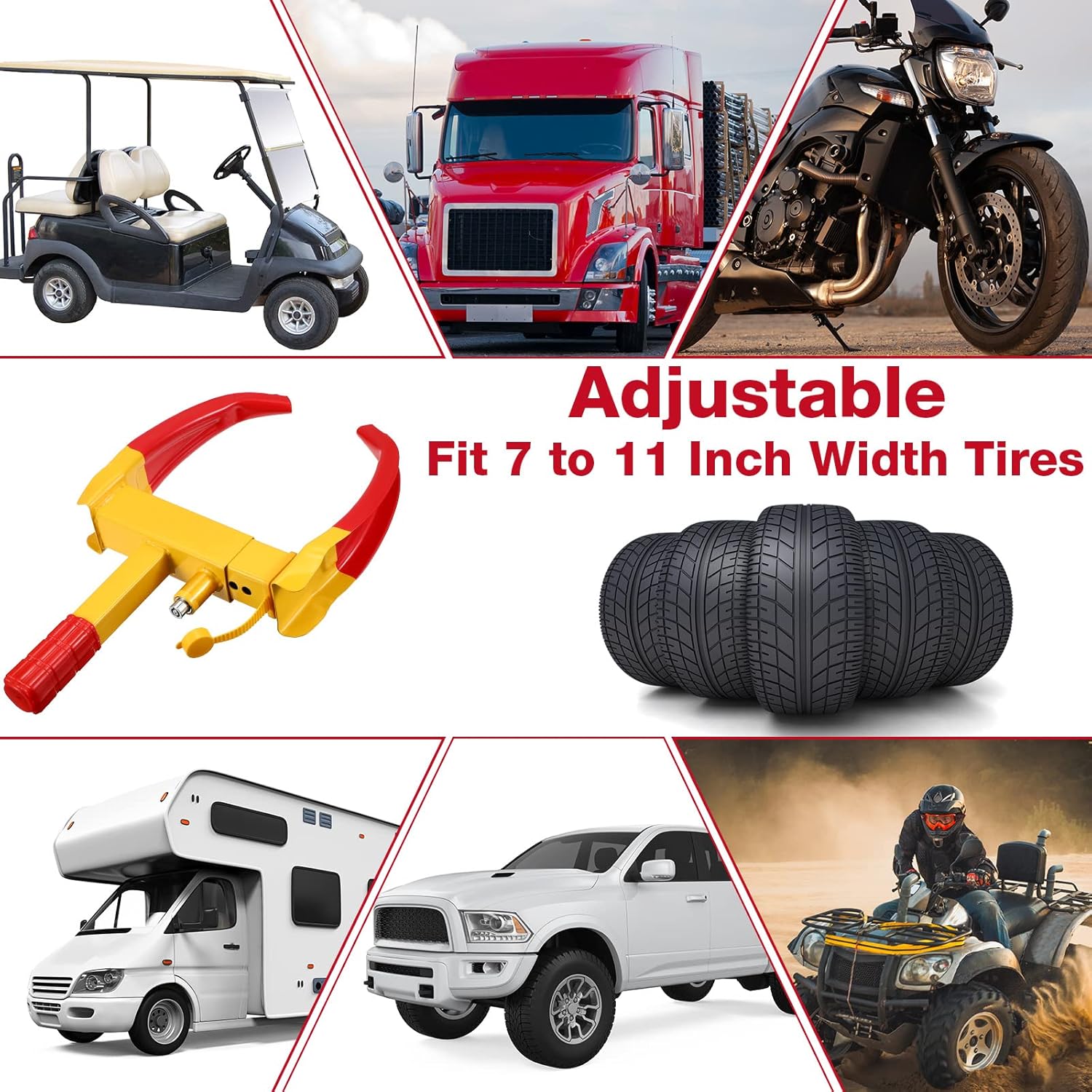 - Funciona con la mayoría de vehículos: el bloqueo de neumáticos de seguridad universal se puede ajustar para adaptarse a neumáticos de 7 a 11 pulgadas de ancho para automóviles, remolques, motocicletas, campistas, camiones, ATV, RV, etc., asegúrate de que el tamaño de bloqueo de la abrazadera de rueda se ajusta al ancho de tu neumático.