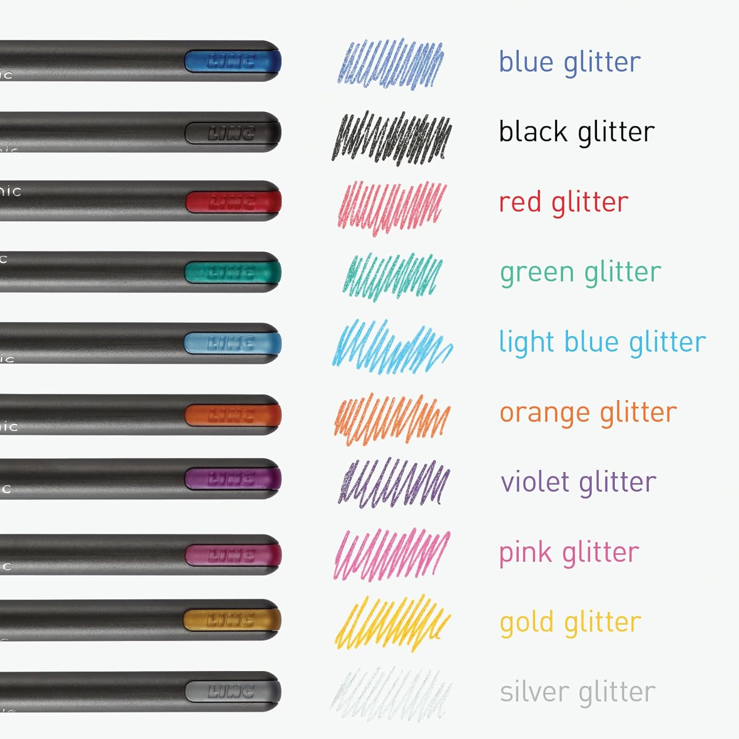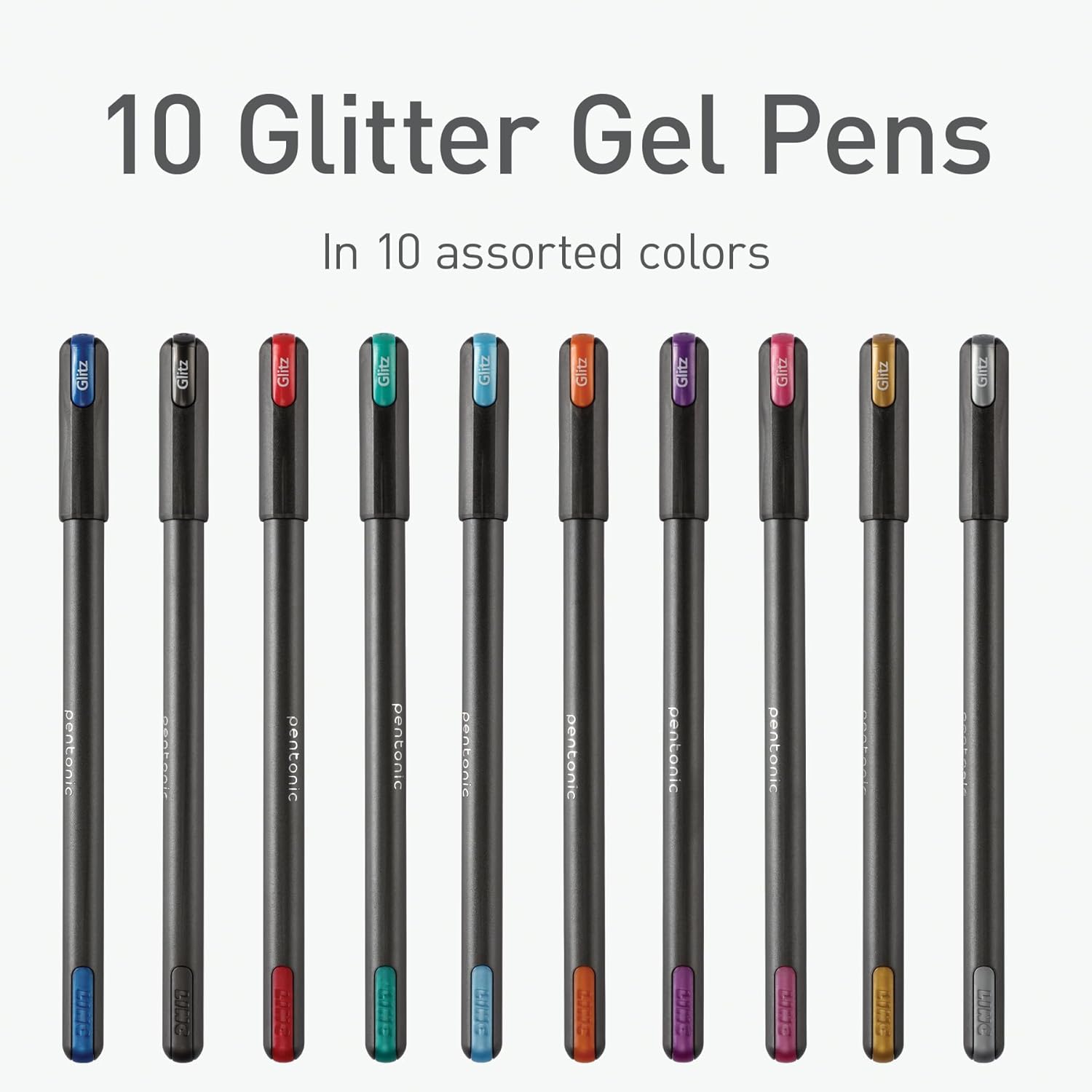 - Este juego de bolígrafos de gel con purpurina multicolor Pentonic viene con 10 bolígrafos con purpurina en 10 colores diferentes: negro, rojo, verde, azul, azul claro, naranja, morado, rosa, oro, plata.