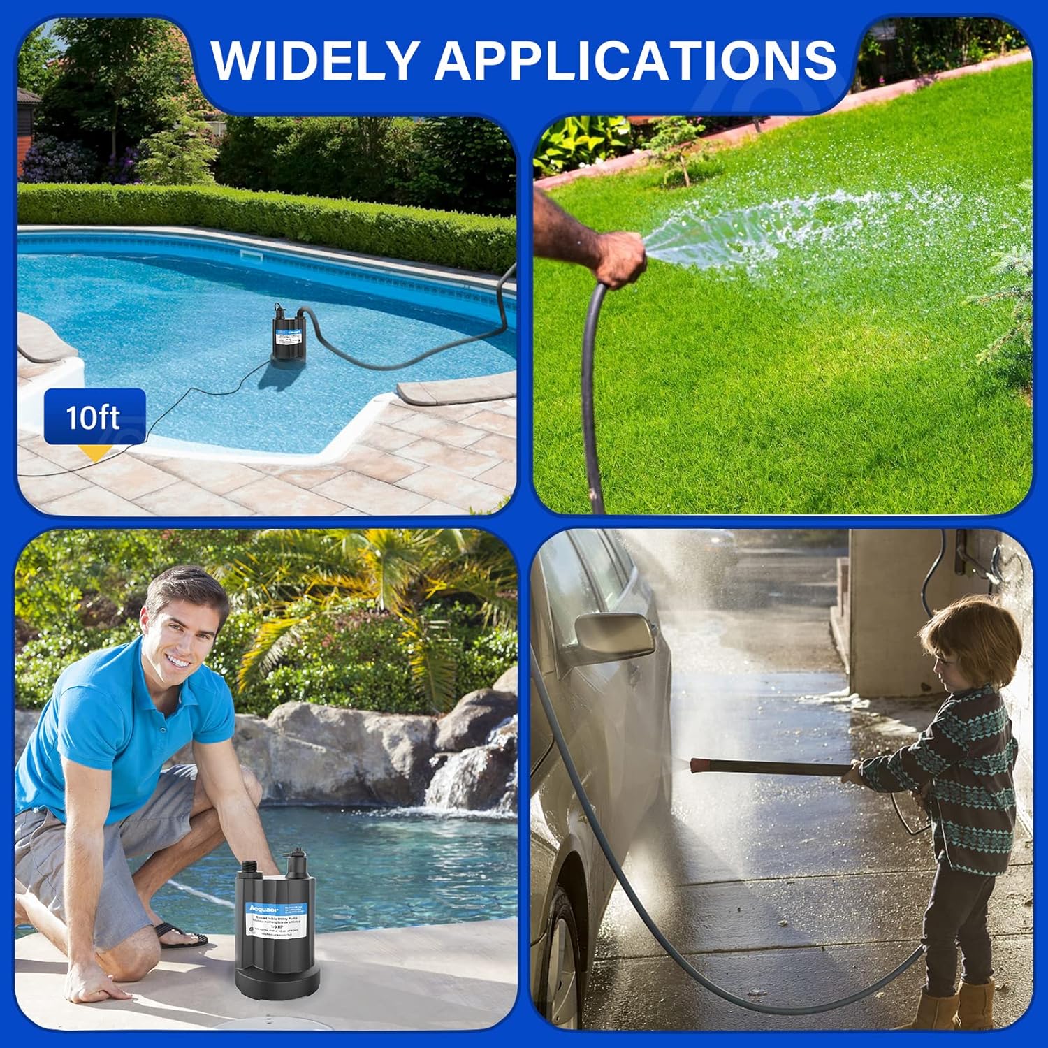 - Amplia aplicación: la bomba sumergible se puede operar fácilmente conectando a la fuente de alimentación. Adecuado para drenar agua de cubiertas de piscina, sótanos, pozos, estanques, pozos de ventanas, barriles de lluvia u otras áreas inundadas. La bomba de utilidad también es perfecta para irrigar, limpiar jardines, lavar autos y otros requisitos del hogar.