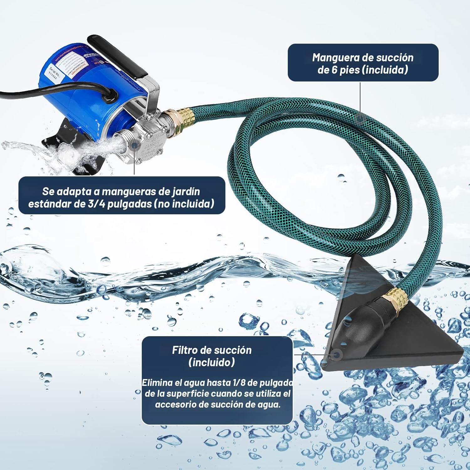 - Bomba eléctrica de transferencia de agua: voltios/frecuencia: 115 V/60 HZ; Potencia: 1/10 HP; Velocidad de flujo máximo: 330 GPH; Descarga: 3/4 in.GHT; Elevación de succión máxima: 6 pies; Cabezal de descarga máximo: 40 pies; Puerto de descarga: 3/4 pulgadas; puerto de succión: 3/4 pulgadas. Esta es una bomba de transferencia no sumergible, así que no mojes el motor.