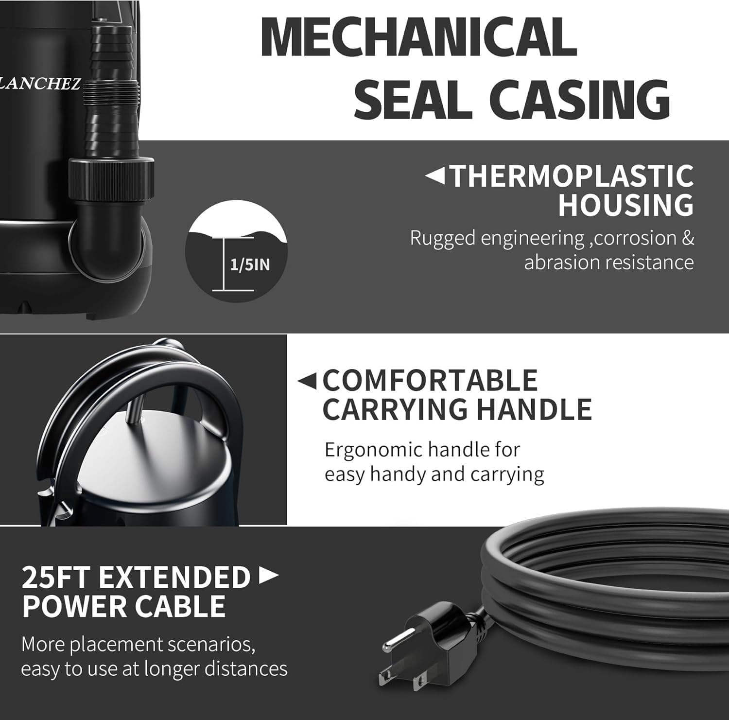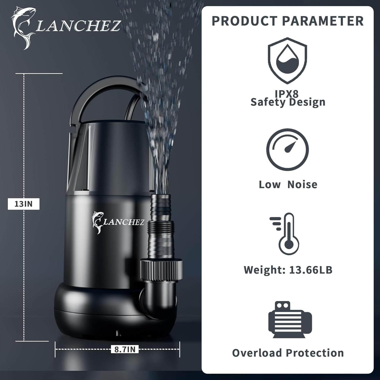 - Bomba de sumidero eficiente: Bomba de agua sumergible LANCHEZ con motor de cable de cobre de 3/4 HP que garantiza suficiente potencia, reduce el consumo y el ruido. Descarga hasta 4450 GPH (74 GPM) y eleva hasta 12 m (40 pies) de altura. Su diseño de base baja permite drenar hasta 5 mm (0,2 pulgadas) de nivel de agua, eliminando así los problemas de drenaje. Se adapta para drenar agua limpia o ligeramente sucia.