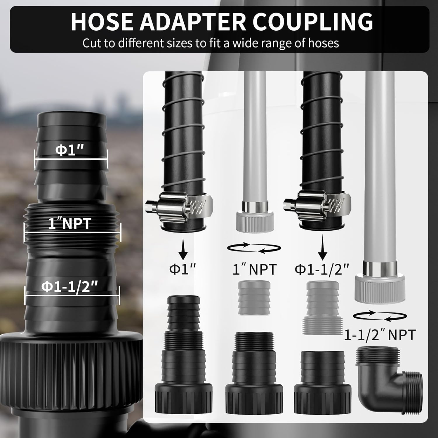 - Buena compatibilidad. El práctico asa superior facilita su transporte. Descarga NPT de 1-1/2", adaptador de codo NPT de 1-1/2" y adaptador multimanguera, compatibles con varios tamaños de manguera. Equipado con un cable de alimentación de 7,6 m, se puede utilizar en una amplia gama de aplicaciones sin necesidad de un cable de extensión.