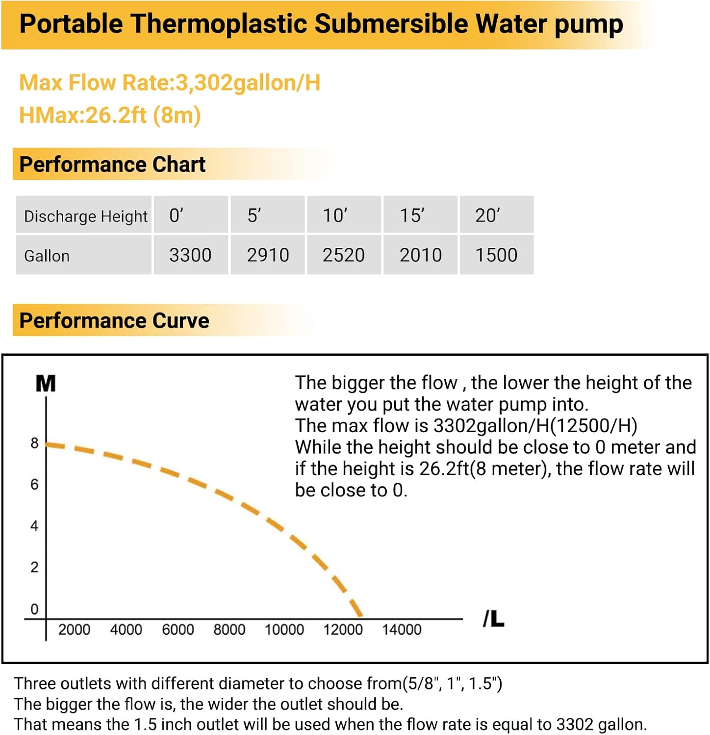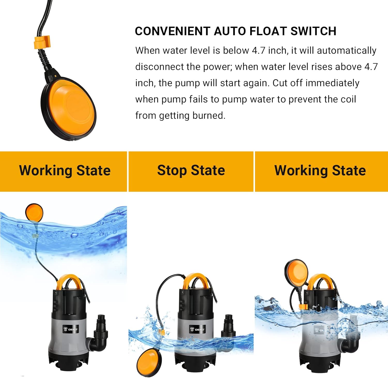 - Potente bomba de sumidero: bomba de sumidero de 750 W, un motor de alto rendimiento que produce una gran potencia de 1 HP. El máximo El flujo de drenaje es de 3302 GPH (12500 l/h), esta bomba de sumidero tiene una placa base más alta, que puede pasar fácilmente a través de sólidos con un diámetro de 35 mm. Ya no te preocupes por quedarte atascado.