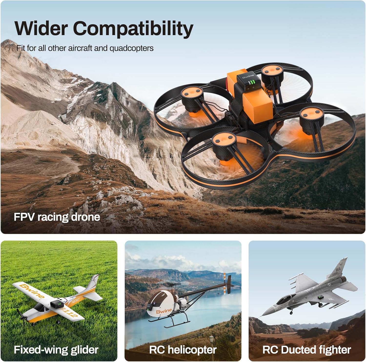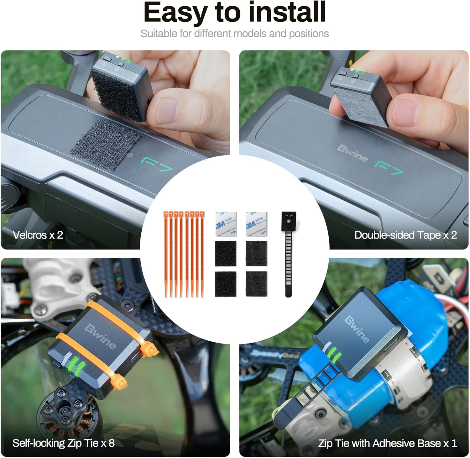 - Compatibilidad ultra amplia: se adapta a drones FPV, planeadores RC, helicópteros, cazas a reacción, aviones de ala fija, multirotores, parapentes y modelos de nicho. Incluye 4 herramientas de instalación: velcro, cinta, bridas de cierre y bases adhesivas para un montaje seguro.