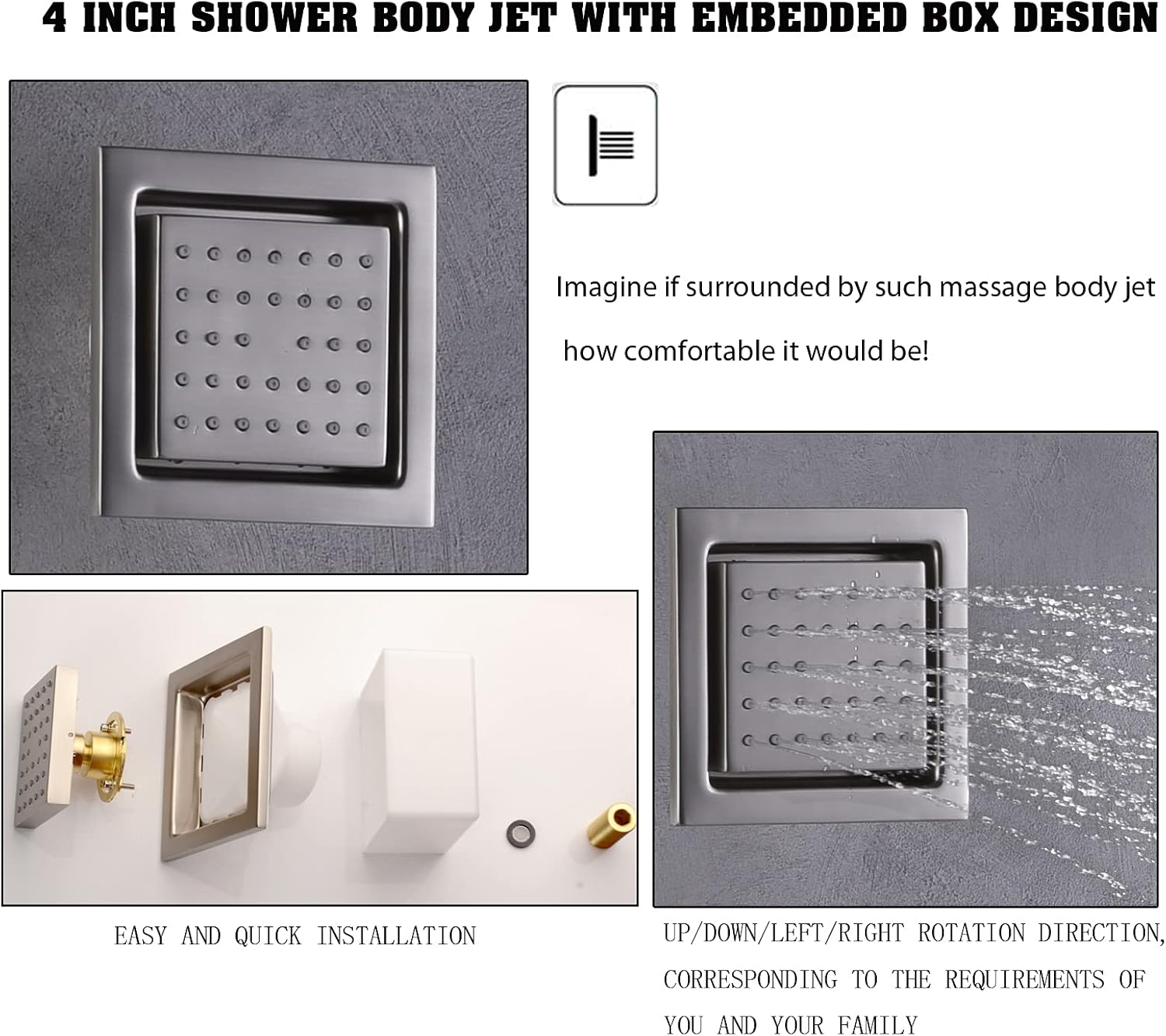 - Diseño de caja integrada + acabado cromado/negro/cepillado. 4 chorros corporales (latón + ABS): relajación de masaje: 4 chorros corporales de masaje te ayudan a relajar tus músculos. El suministro de agua a alta presión funciona muy bien con esto
