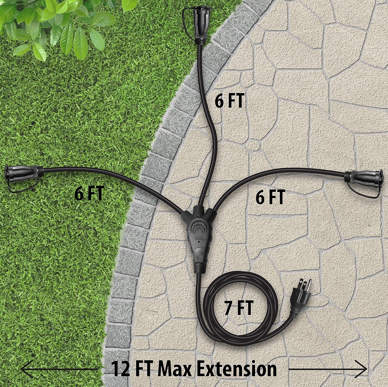 - 3 salidas espaciadas uniformemente: 7.62 m de longitud total; el primer enchufe está a una longitud de cable de 2.74 m, espaciado uniformemente cada 2.44 m de distancia del resto de dos enchufes; el cable de extensión de 3 clavijas es ideal para configurar iluminación de paisaje y decoraciones de Navidad con menos cable, mantiene tu patio organizado y ordenado.
