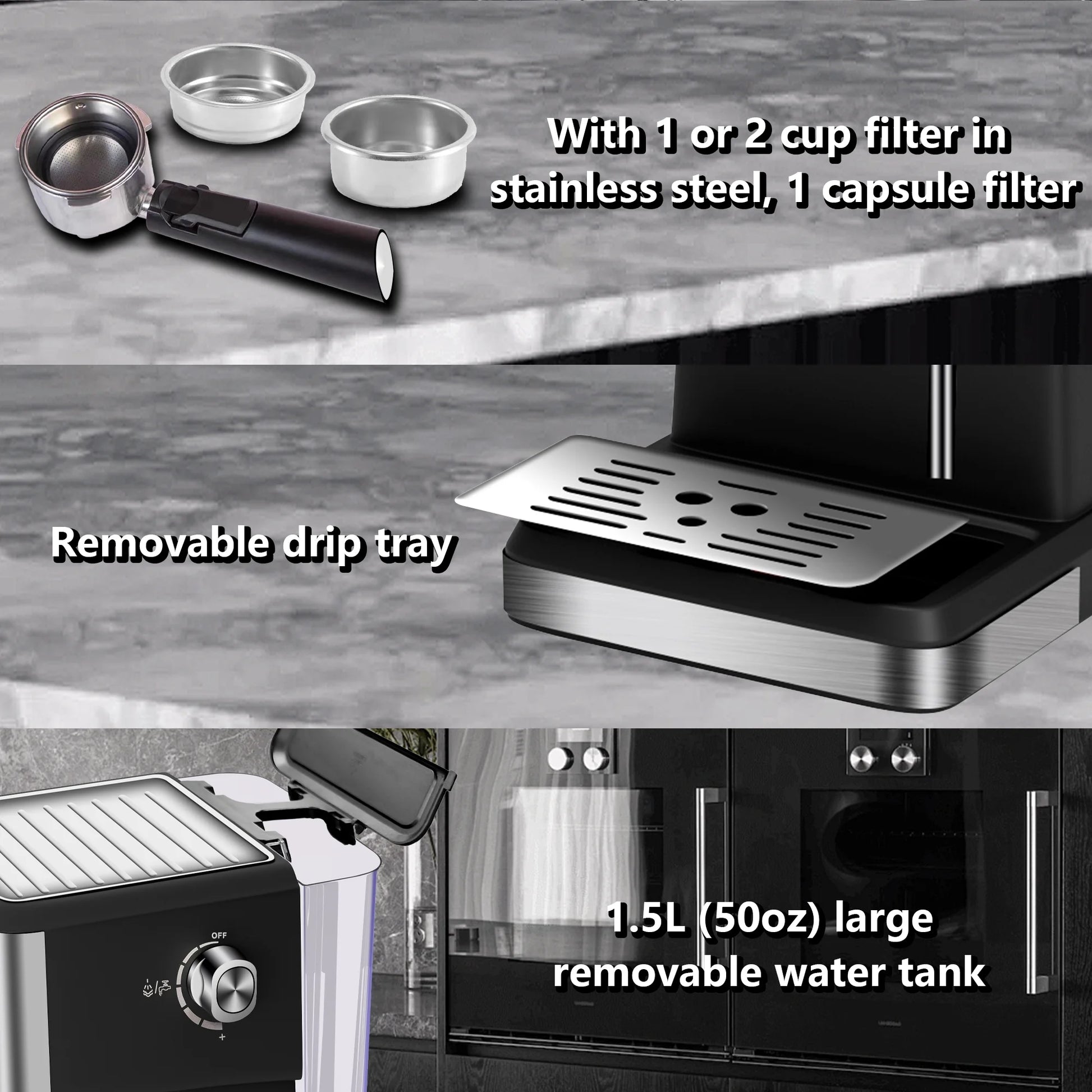 - PRESIÓN DE 20 BAR PARA UNA EXTRACCIÓN DE MAYOR CALIDAD: La máquina de café espresso cuenta con una bomba de alta presión de 20 bar que crea una agradable densidad, maximiza la extracción del aroma de los granos de café y desarrolla la calidad de los aceites naturales.