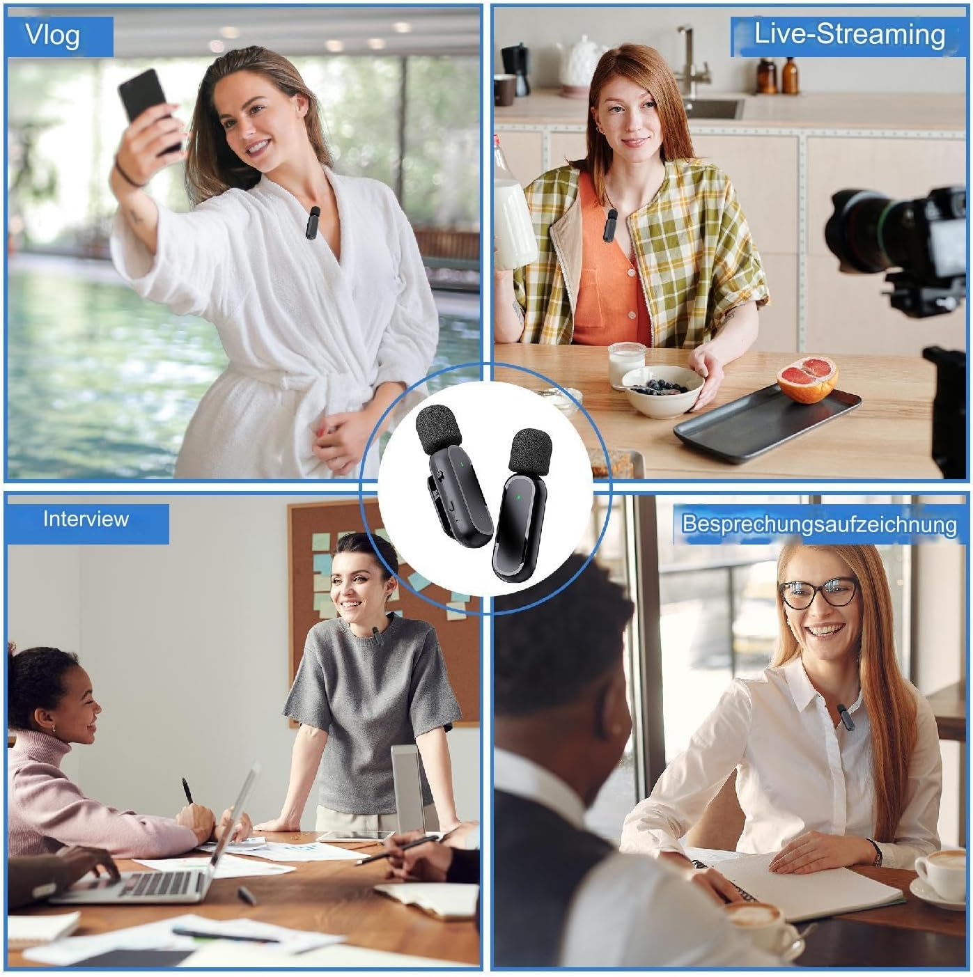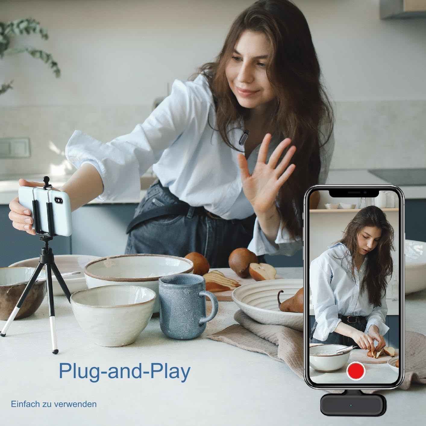 - Plug and Play: no requiere Bluetooth ni aplicación. El micrófono Lavalier inalámbrico se puede fijar al cuello para permitir la grabación de audio y video manos libres. Simplemente inserte el receptor en su dispositivo y encienda el micrófono, pronto funcionará para usted.