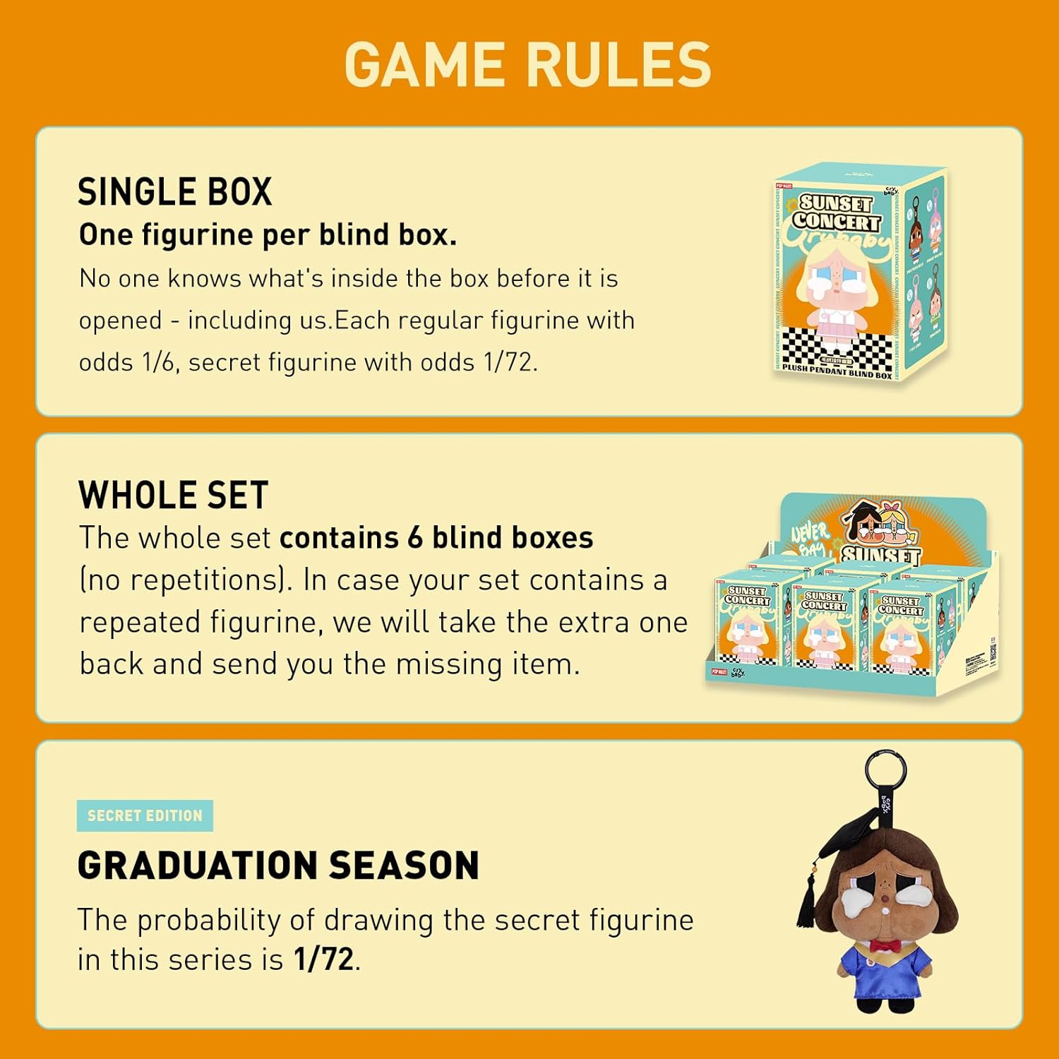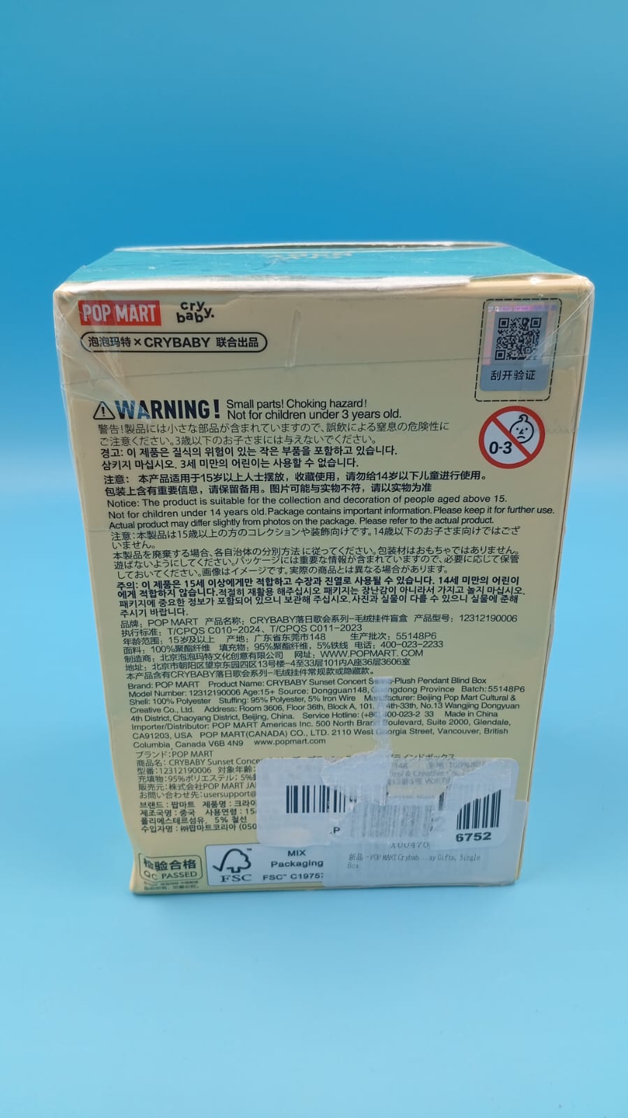 - POP MART CRYBABY Sunset Concert Series-Plush Pendant Blind Box: La caja ciega contiene una figura aleatoria de una serie específica. Cada caja ciega solo contiene una figura. Nadie, incluidos nosotros, sabe lo que hay dentro, una de ellas podría ser la edición secreta.