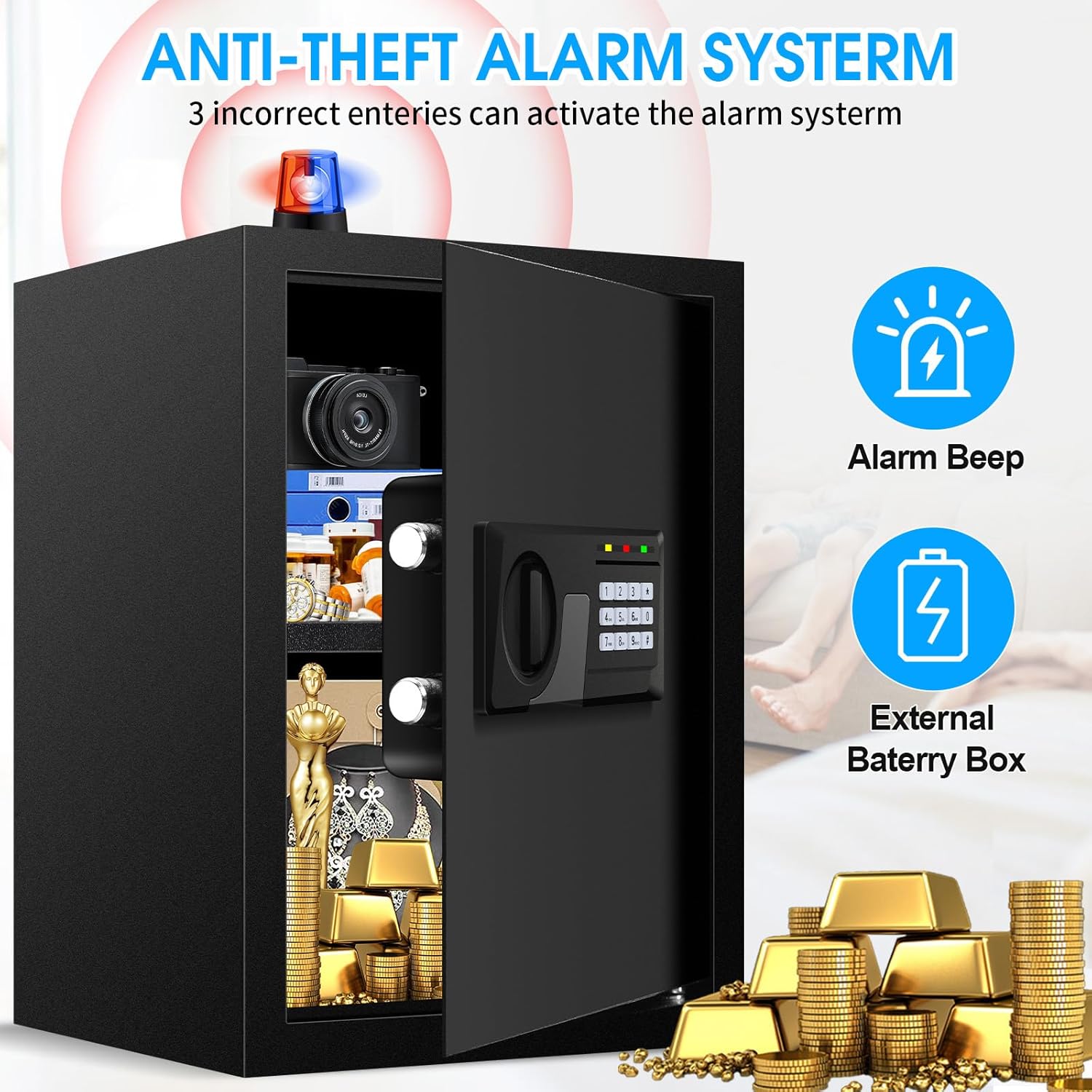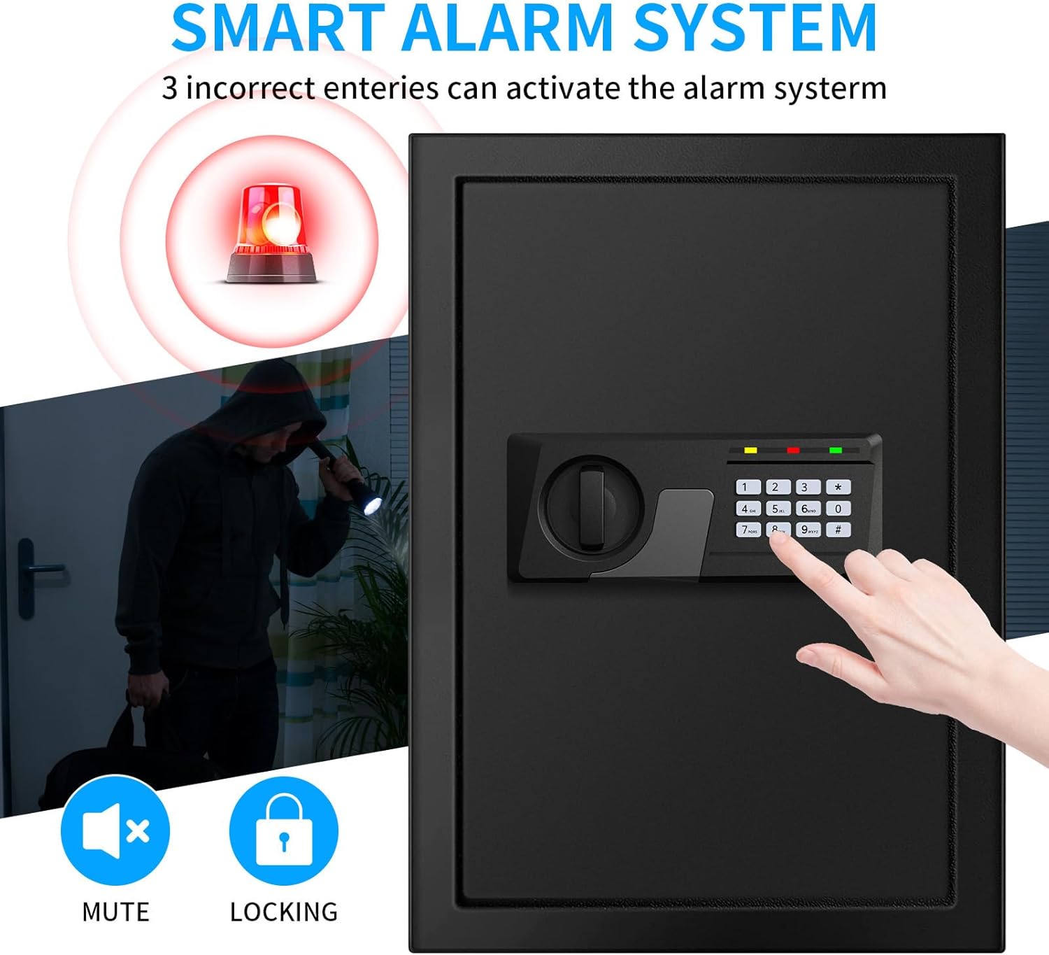- todo el acceso ilegal está denegado. Nuestra caja fuerte ignífuga proporciona un sistema de bloqueo de seguridad: si ingresas la contraseña incorrecta 3 veces seguidas, el sistema se bloqueará durante 20 segundos; si ingresas la contraseña incorrecta 6 veces seguidas, se bloqueará durante 5 minutos y suena una alarma para alertarte de acceso no autorizado.
