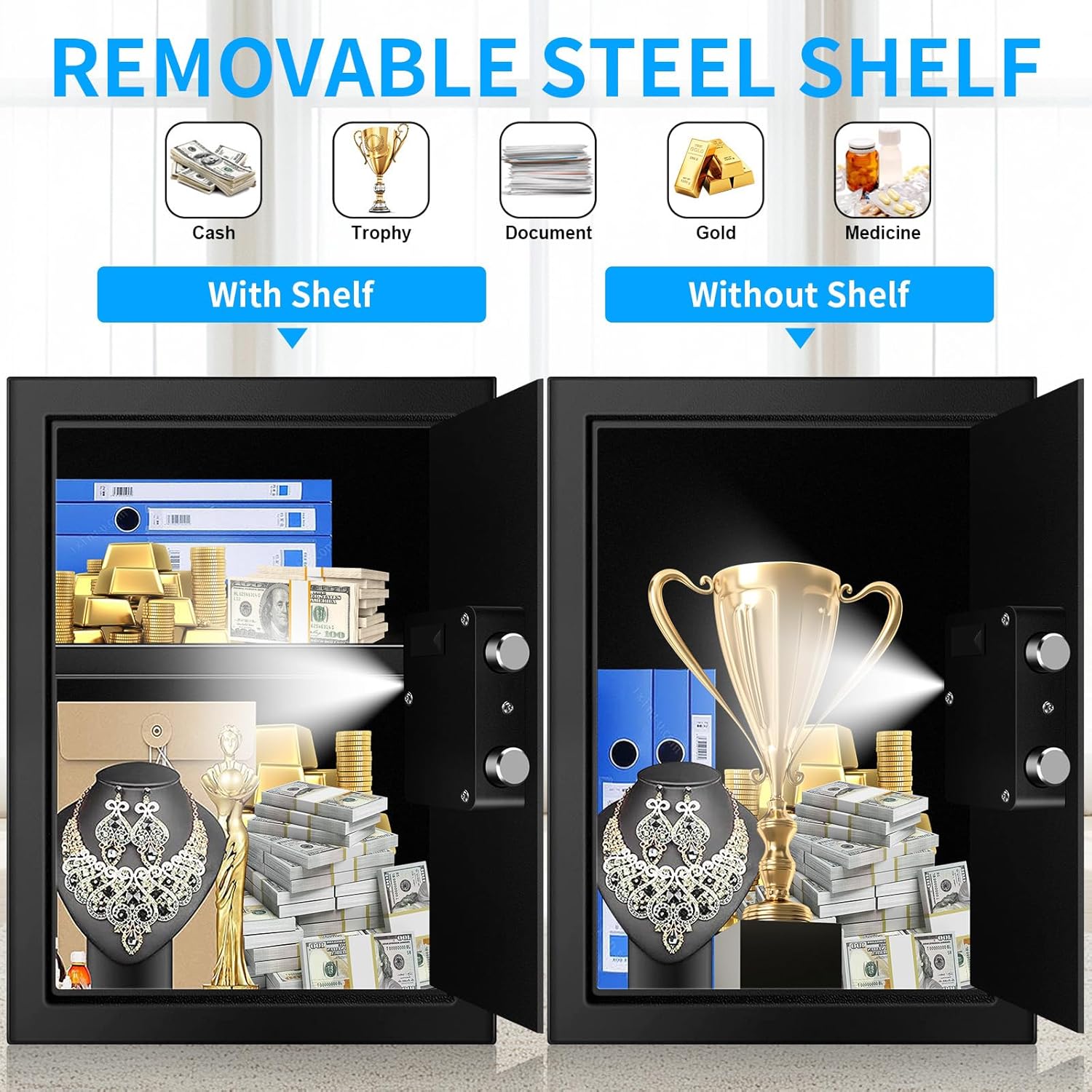 Tamaño exterior: 19.7 x 13.7 x 12.2 pulgadas (alto x ancho x profundidad), Tamaño interior: 19 x 13 x 12 pulgadas (alto x ancho x profundidad). Peso de 15 kg. Perfecto para guardar pistolas, miles de municiones y objetos de valor. El gran espacio interior con un estante extraíble te permite acomodar cosas de diferentes tamaños que quieras almacenar. Regalo perfecto para hogares, hoteles, dormitorios y oficinas.