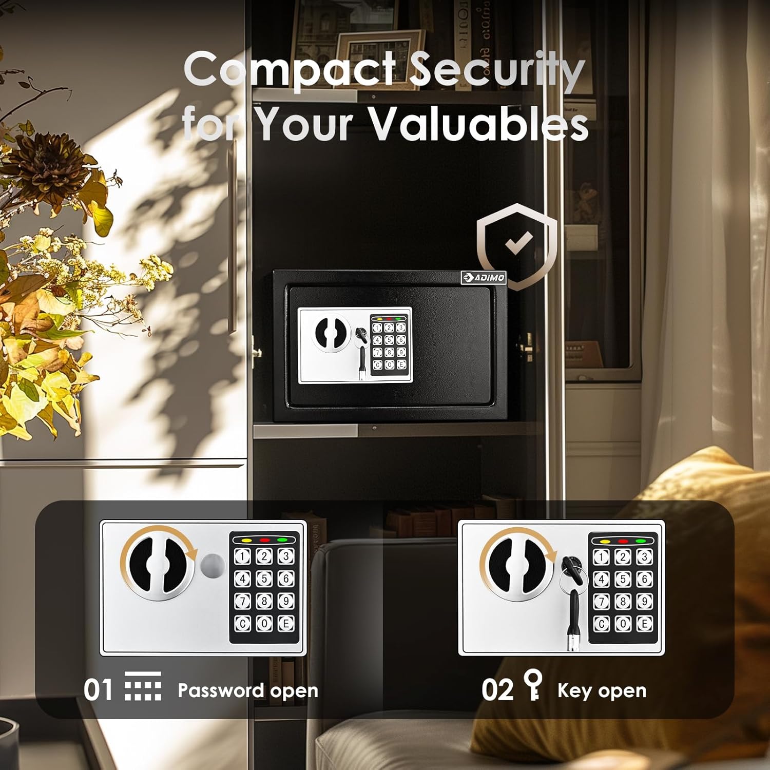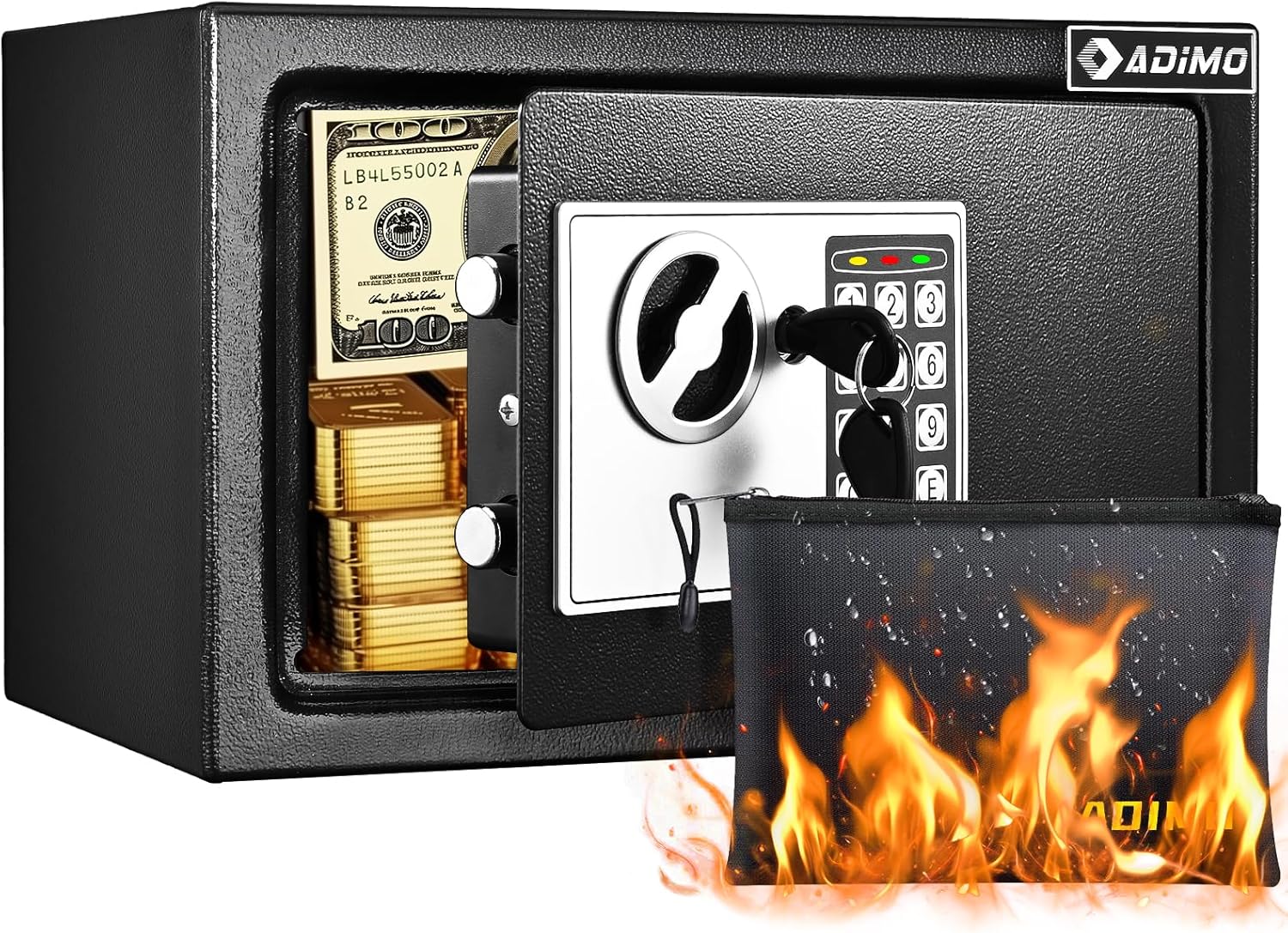 - Bolsa impermeable e ignífuga: la caja fuerte ADIMO viene con una bolsa de documentos impermeable e ignífuga, se puede utilizar para almacenar efectivo, cheques, joyas, tarjetas de crédito y documentos importantes, protegiendo tus objetos de valor del fuego, huracanes y terremotos. (Nota: este tamaño de bolsa es de 14.7 x 9.3 pulgadas, no se puede utilizar directamente en esta caja fuerte ADIMO 0.5 Cubic y debe usarse por separado.