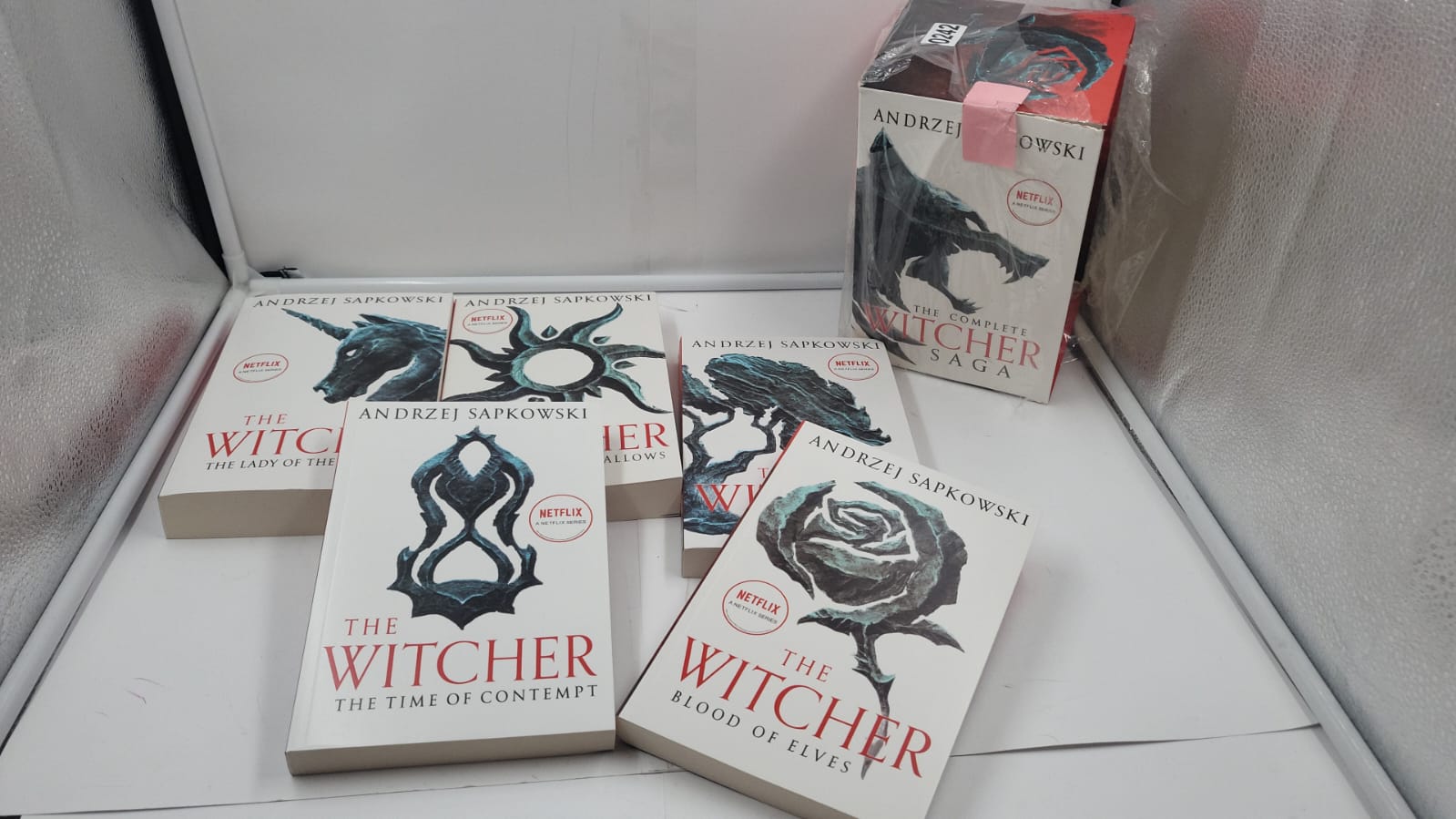Caja de The Witcher: Sangre de Elfos, El Tiempo del Desprecio, Bautismo de Fuego, La Torre de las Golondrinas, La Dama del Lago.