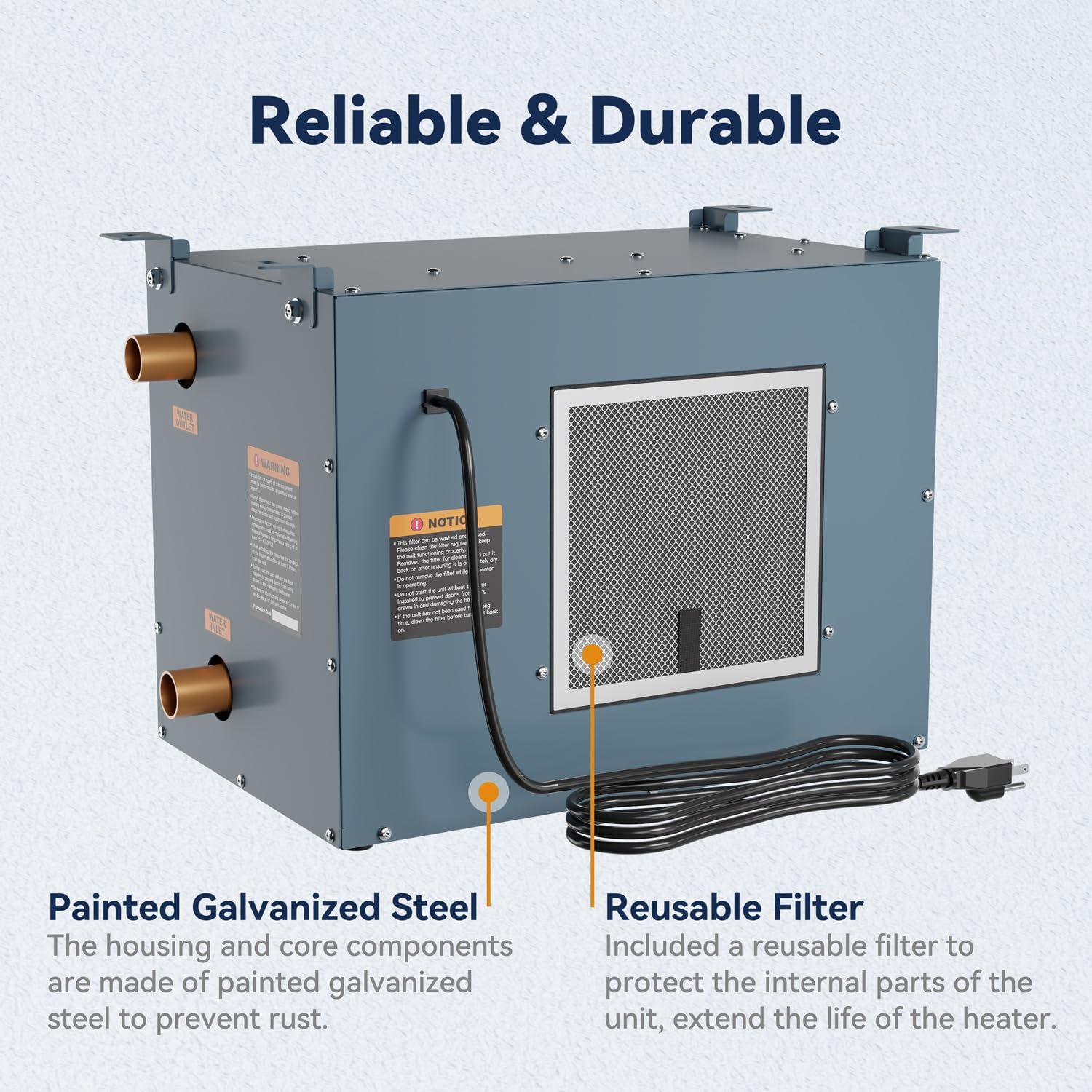 - Calidad confiable: los componentes de la carcasa y del núcleo están hechos de acero galvanizado pintado y para evitar el óxido. También incluye un filtro reutilizable para proteger las partes internas de la unidad, prolongar la vida útil del calentador.
