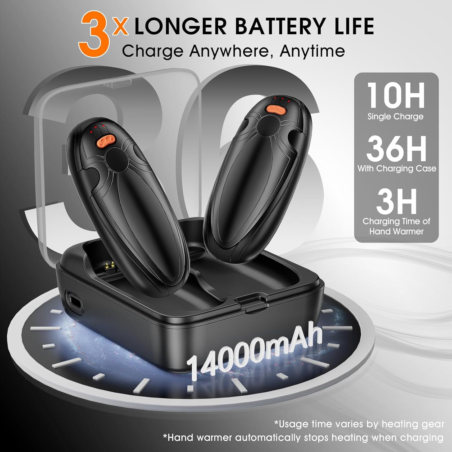 - Nuestro innovador paquete de 2 calentadores de manos recargables cuenta con una batería integrada de 14 000 mAh, que proporciona unas impresionantes 36 horas de calor continuo. Con un estuche de carga de 10 000 mAh, puedes recargar tus dos calentadores de manos 2,5 veces sobre la marcha. Perfectos para aventuras al aire libre de todo el día o para refrescarte en días fríos, especialmente como accesorio de caza.