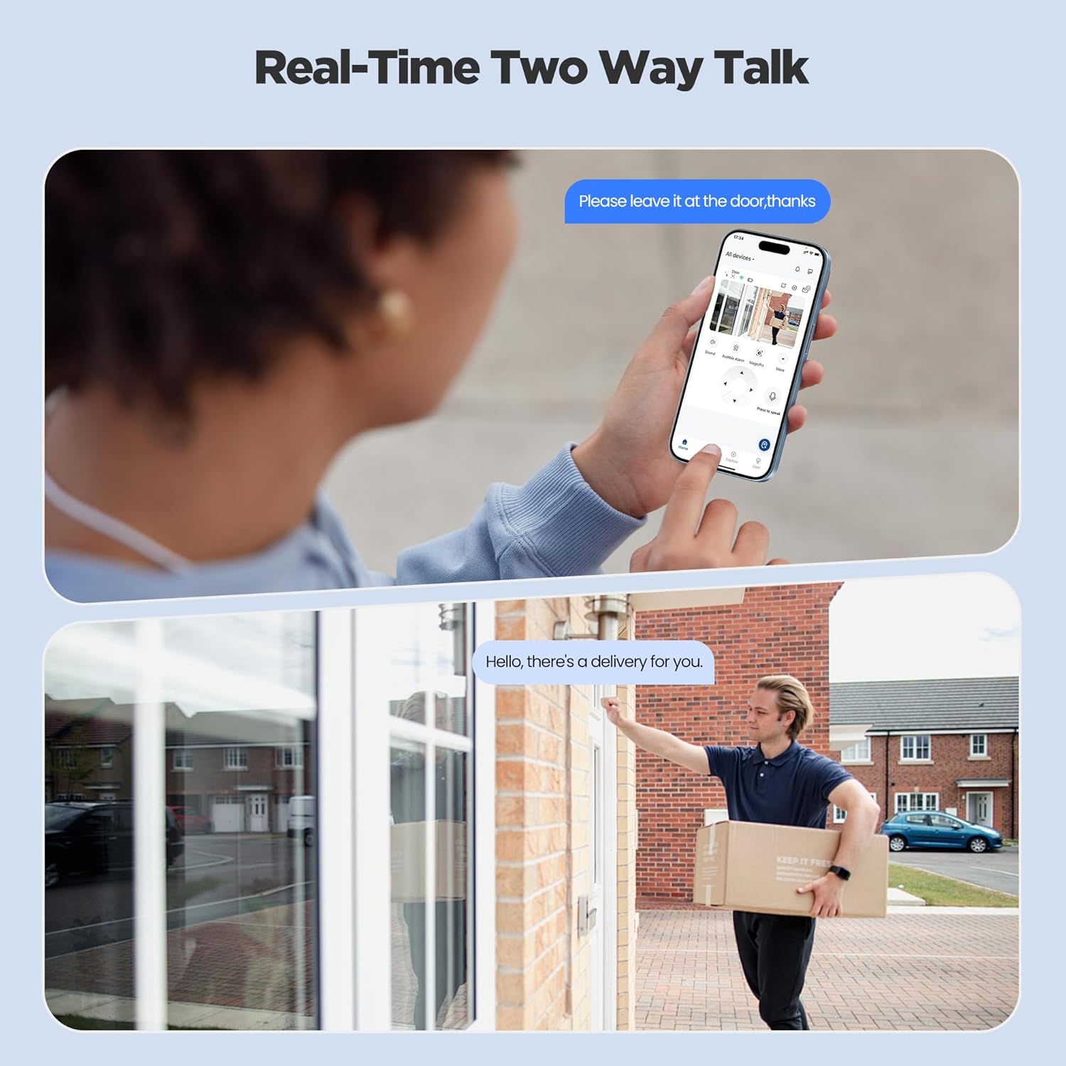 - Luz y sonido de alarma: Puedes configurar la cámara inalámbrica al aire última intervención para emitir un sonido de alarma duro para ahuyentar a intrusos o animales pequeños no deseados. La cámara inalámbrica para exteriores puede emitir automáticamente un sonido al activar una alarma de movimiento. También puedes decir lo que quieras presionando manualmente el icono del micrófono en la aplicación. Mientras deja que la cámara suene automáticamente una alarma, ten en cuenta si afectará a tus vecinos. Su sistema de seguridad para el hogar.