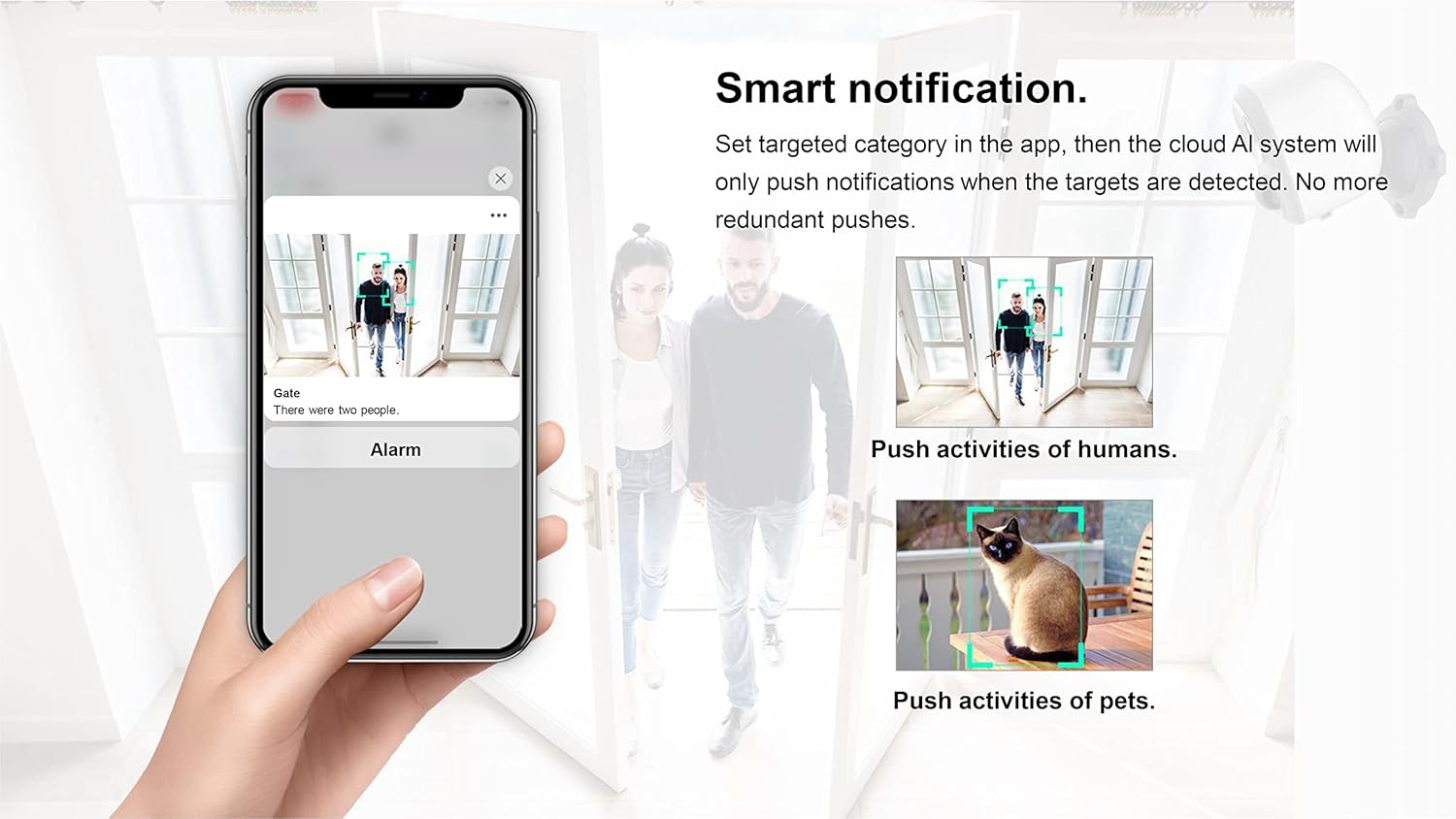 - Conexión inteligente de código QR y asignación de red compatible. Control de aplicación, mira lo que está sucediendo alrededor de tu casa a través de la aplicación, fácil transmisión en vivo y reproducción de video. Compatible con la detección de contorno humano, zona de actividad, empuje inteligente y captura instantánea de mascotas, inspección de paquetes (se requiere servicio de valor añadido). Zona de actividad. Dibuja con precisión zonas de actividad personalizadas en la aplicación móvil. Se filtrará información irrelevante fuera de la zona. El área clave, el enfoque clave.