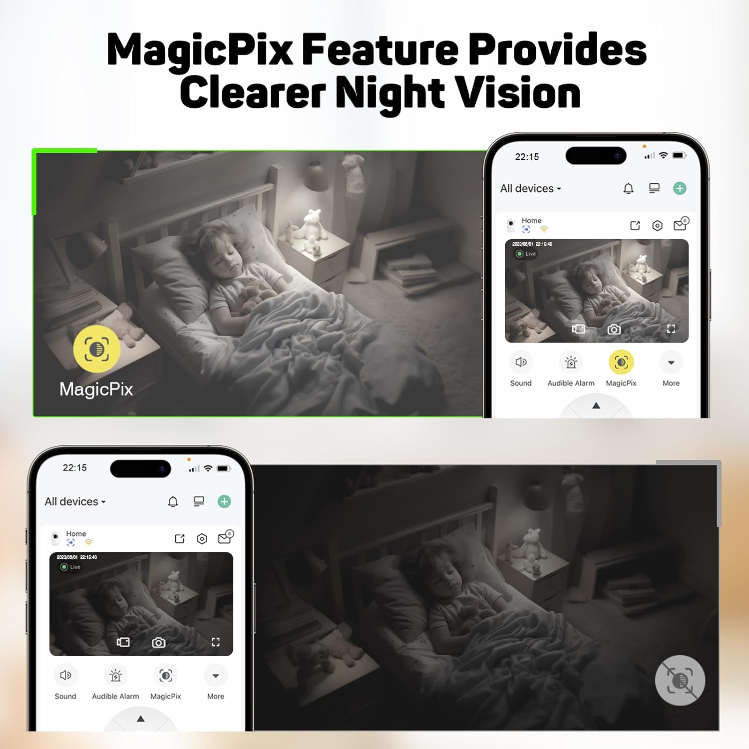- MagicPix Night Vision: esta cámara para interiores tiene un sistema infrarrojo integrado que proporciona 30 pies de visión nocturna, por lo que no se perderá ningún momento, incluso de noche.