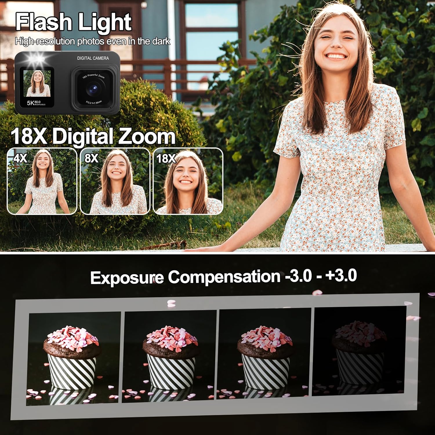 - Cámara digital de doble pantalla 5K mejorada: con alta resolución de 5K80MP, pantalla dual, enfoque automático, zoom digital de 18x, función de belleza facial y flash integrado.